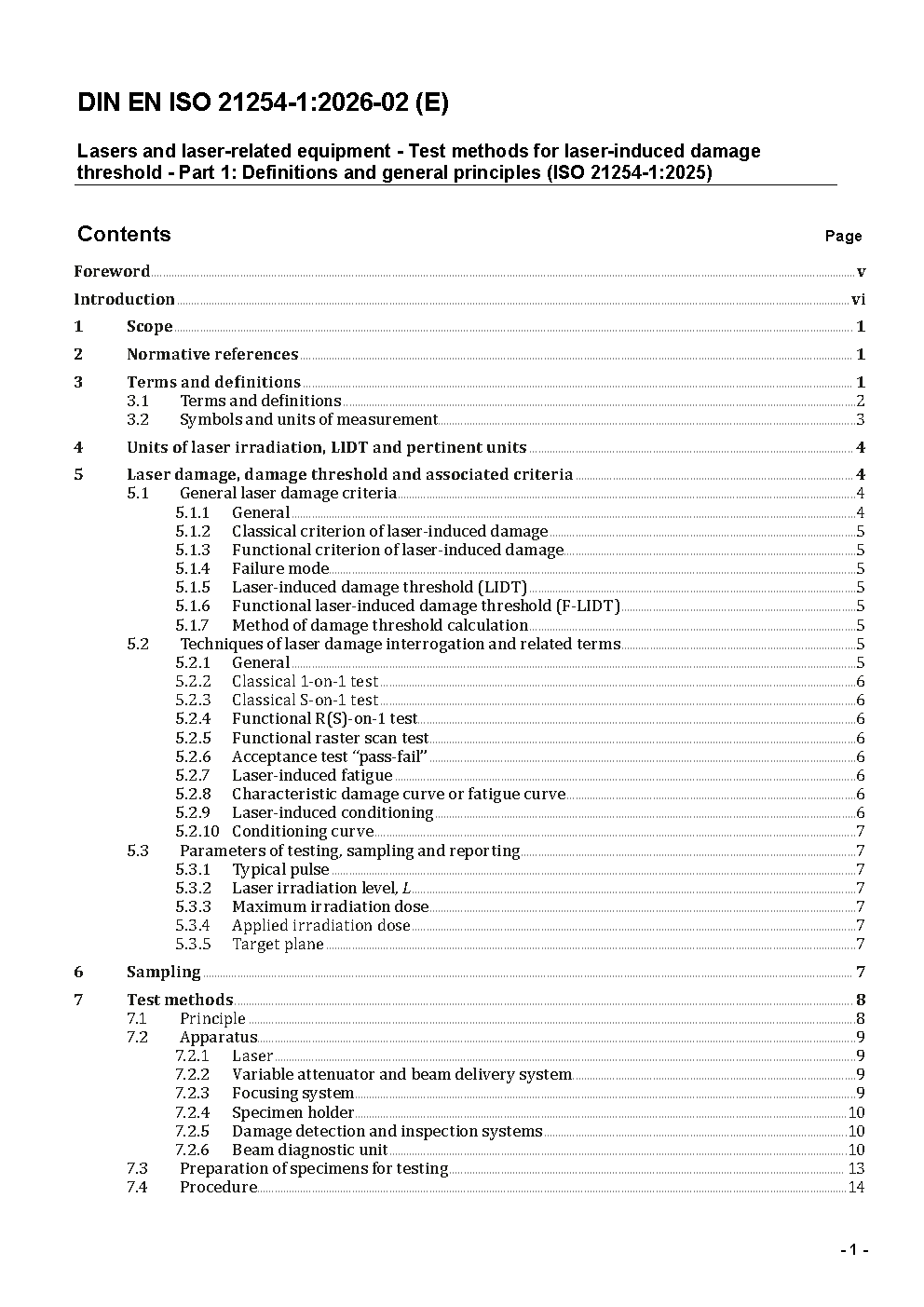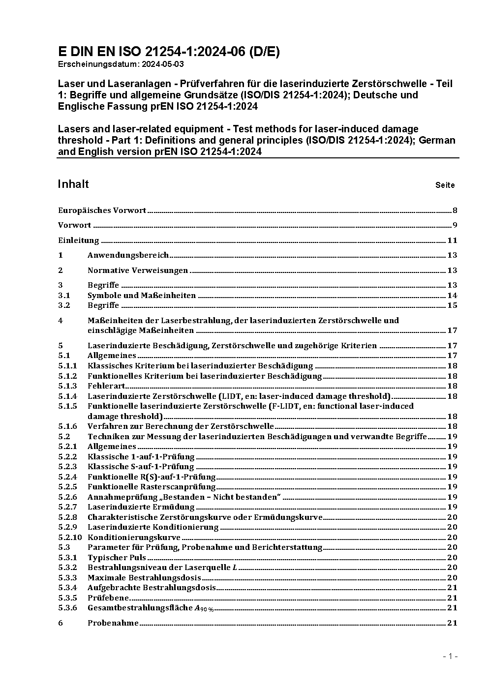Lasers and laser-related equipment - Test methods of laser radiation-induced damage threshold - Part 1: Definitions and general principles (ISO/DIS 21254-1:2008); German version prEN ISO 21254-1:2008