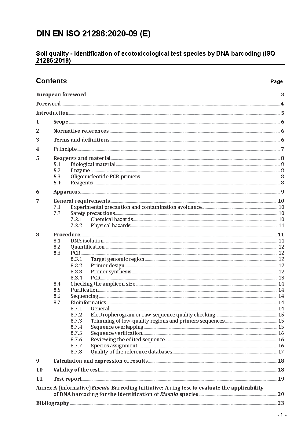 Soil quality - Identification of ecotoxicological test species by DNA barcoding (ISO 21286:2019); German and English version prEN ISO 21286:2019