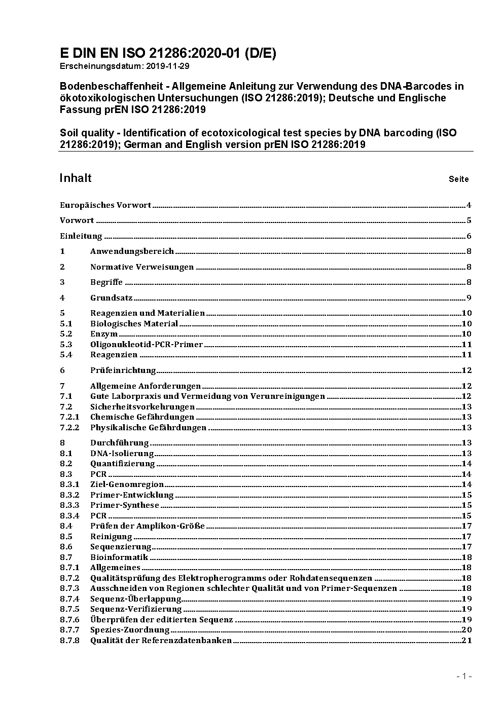 Bodenbeschaffenheit - Allgemeine Anleitung zur Verwendung des DNA-Barcodes in ökotoxikologischen Untersuchungen (ISO 21286:2019); Deutsche und Englische Fassung prEN ISO 21286:2019