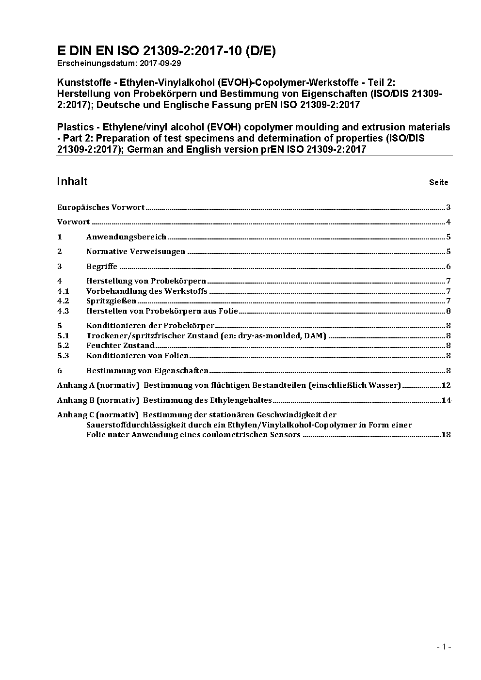 Kunststoffe - Ethylen-Vinylalkohol (EVOH)-Copolymer-Werkstoffe - Teil 2: Herstellung von Probekörpern und Bestimmung von Eigenschaften (ISO/DIS 21309-2:2017); Deutsche und Englische Fassung prEN ISO 21309-2:2017