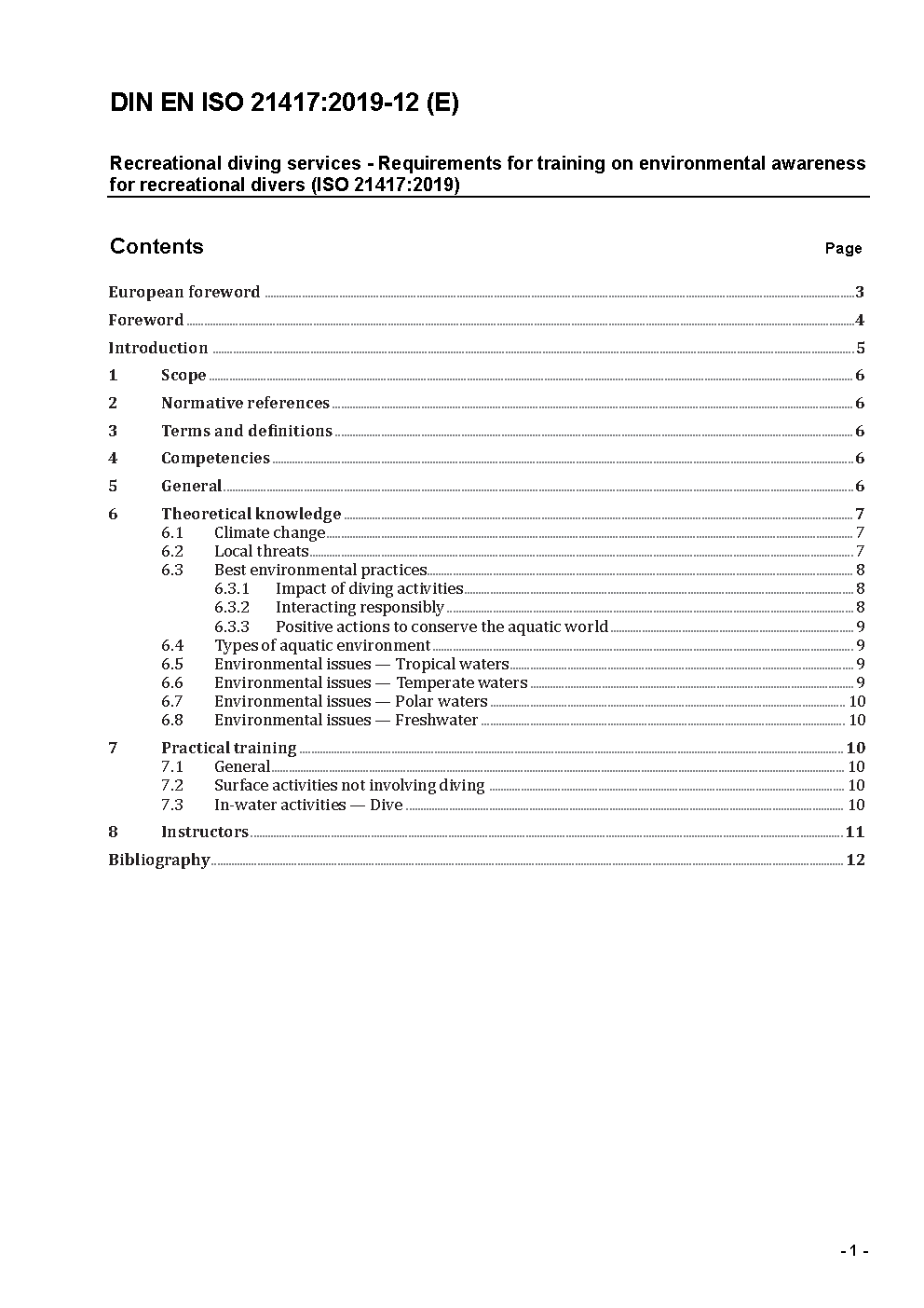 Recreational diving services - Requirements for training on environmental awareness for recreational divers (ISO/DIS 21417:2018); German and English version prEN ISO 21417:2018