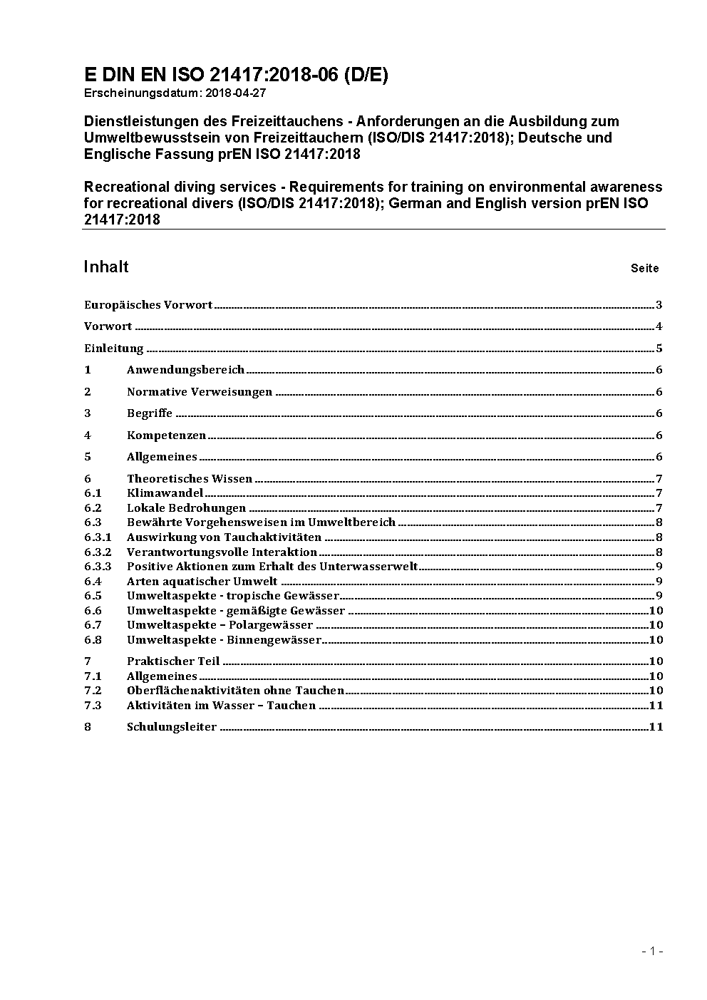 Dienstleistungen des Freizeittauchens - Anforderungen an die Ausbildung zum Umweltbewusstsein von Freizeittauchern (ISO/DIS 21417:2018); Deutsche und Englische Fassung prEN ISO 21417:2018