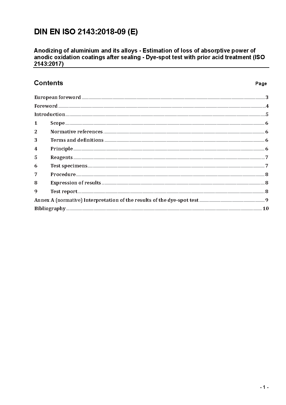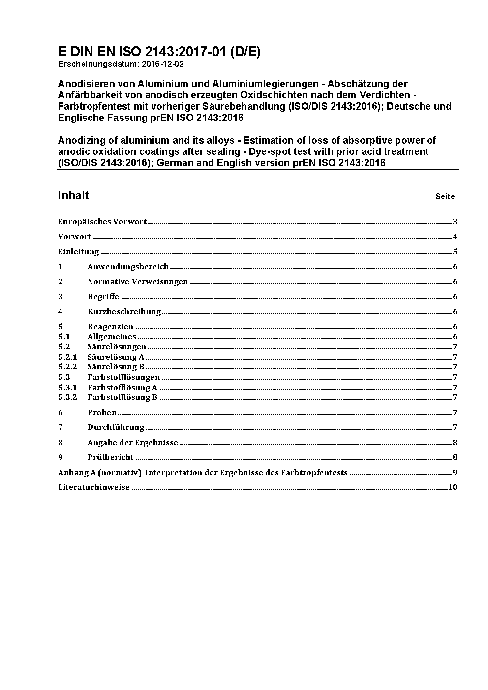 Anodizing of aluminium and its alloys - Estimation of loss of absorptive power of anodic oxidation coatings after sealing - Dye-spot test with prior acid treatment (ISO/DIS 2143:2016); German and English version prEN ISO 2143:2016