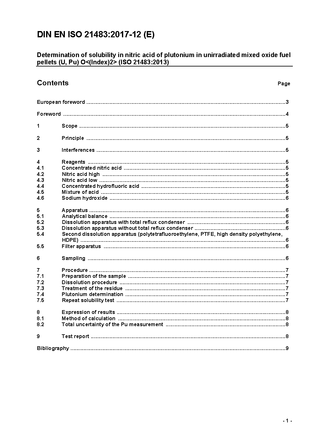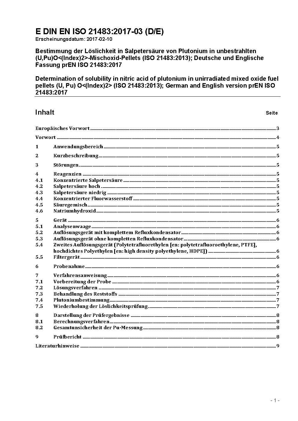 Bestimmung der Löslichkeit in Salpetersäure von Plutonium in unbestrahlten (U, Pu) O<(Index)2>-Mischoxid-Pellets (ISO 21483:2013); Deutsche und Englische Fassung prEN ISO 21483:2017
