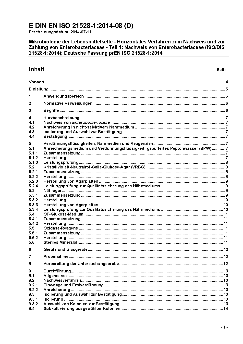 Mikrobiologie der Lebensmittelkette - Horizontales Verfahren zum Nachweis und zur Zählung von Enterobacteriaceae - Teil 1: Nachweis von Enterobacteriaceae (ISO/DIS 21528-1:2014); Deutsche Fassung prEN ISO 21528-1:2014