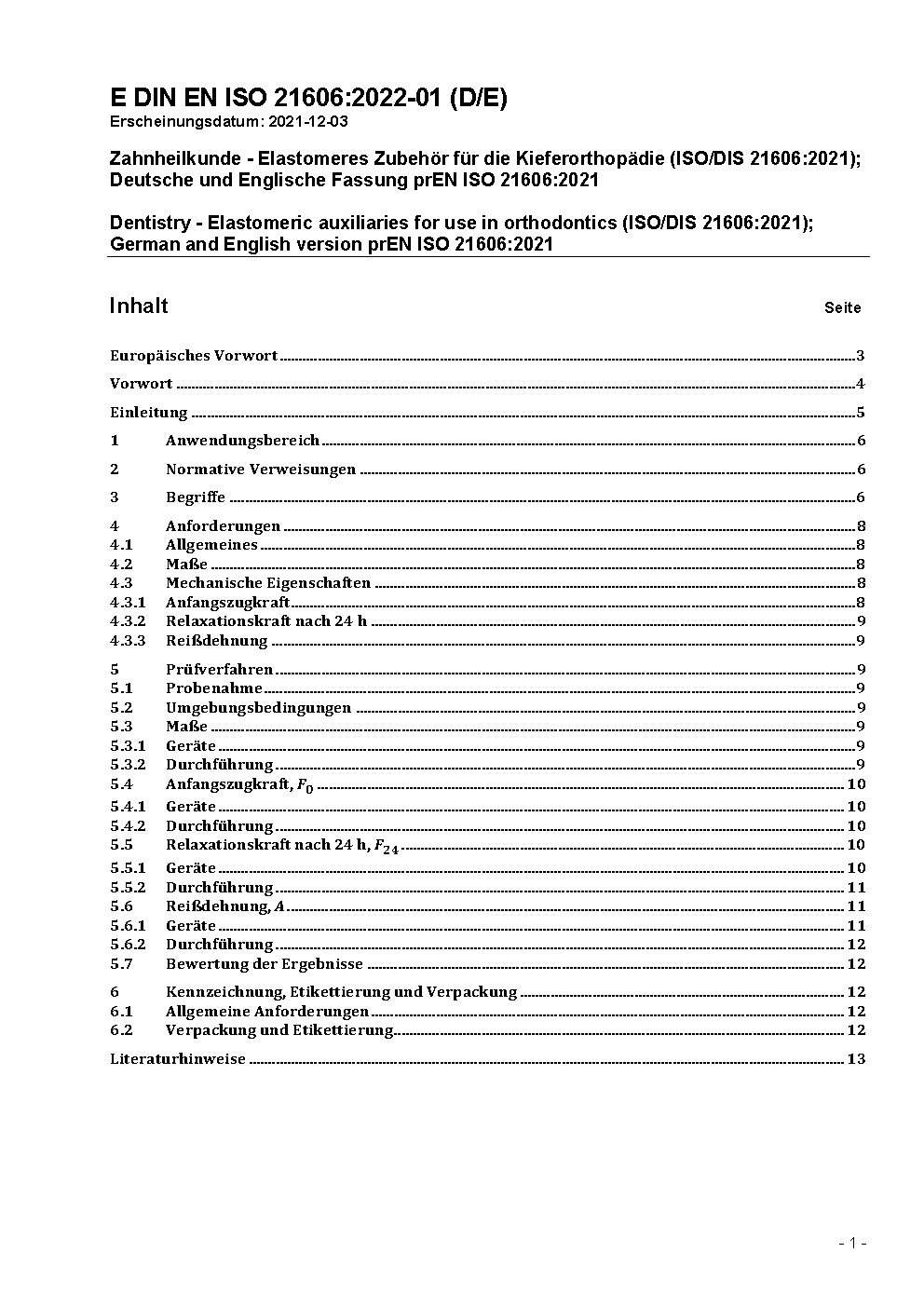 Zahnheilkunde - Elastomeres Zubehör für die Kieferorthopädie (ISO/DIS 21606:2021); Deutsche und Englische Fassung prEN ISO 21606:2021