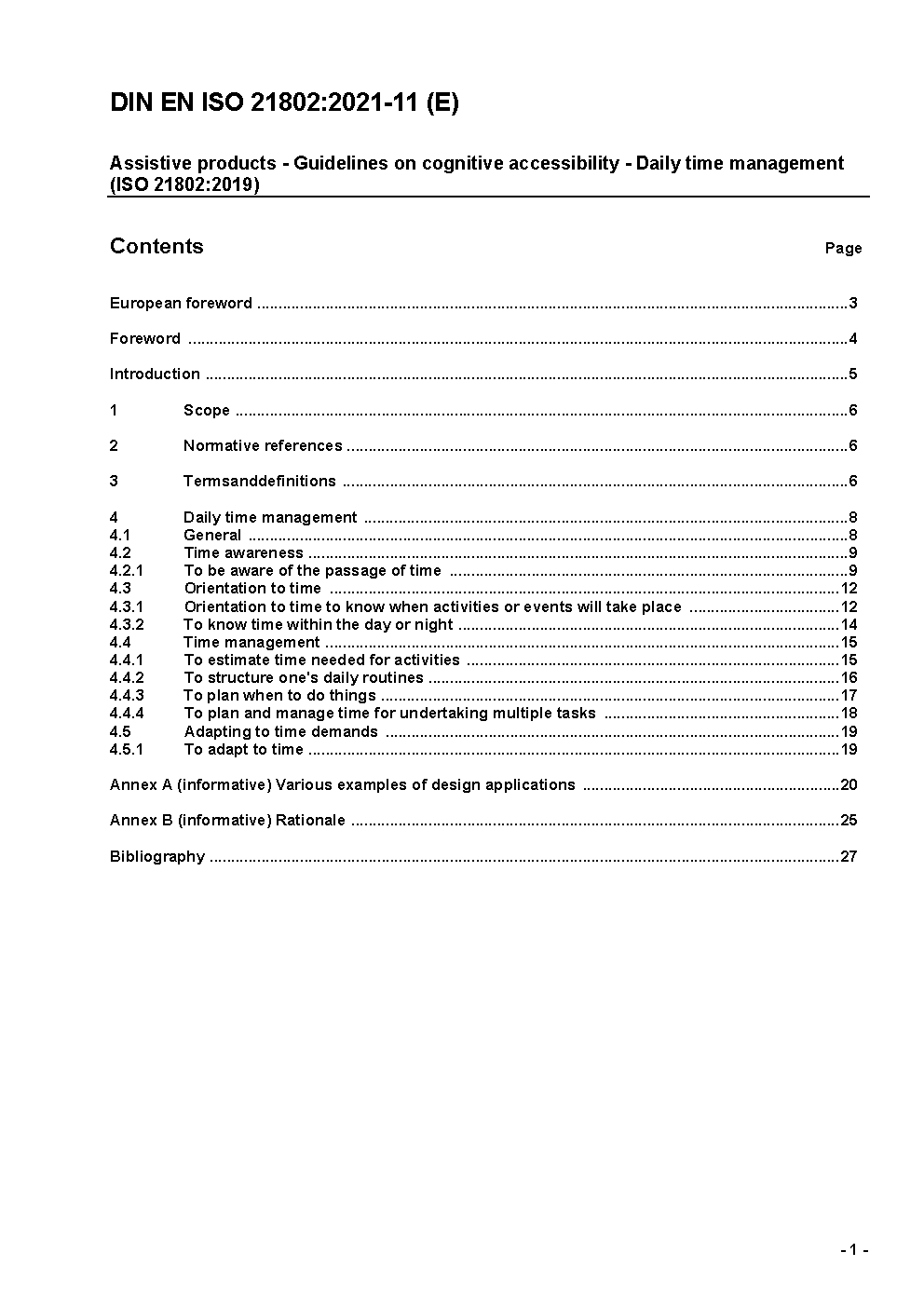 Assistive products - Guidelines on cognitive accessibility - Daily time management (ISO 21802:2019); German version EN ISO 21802:2021