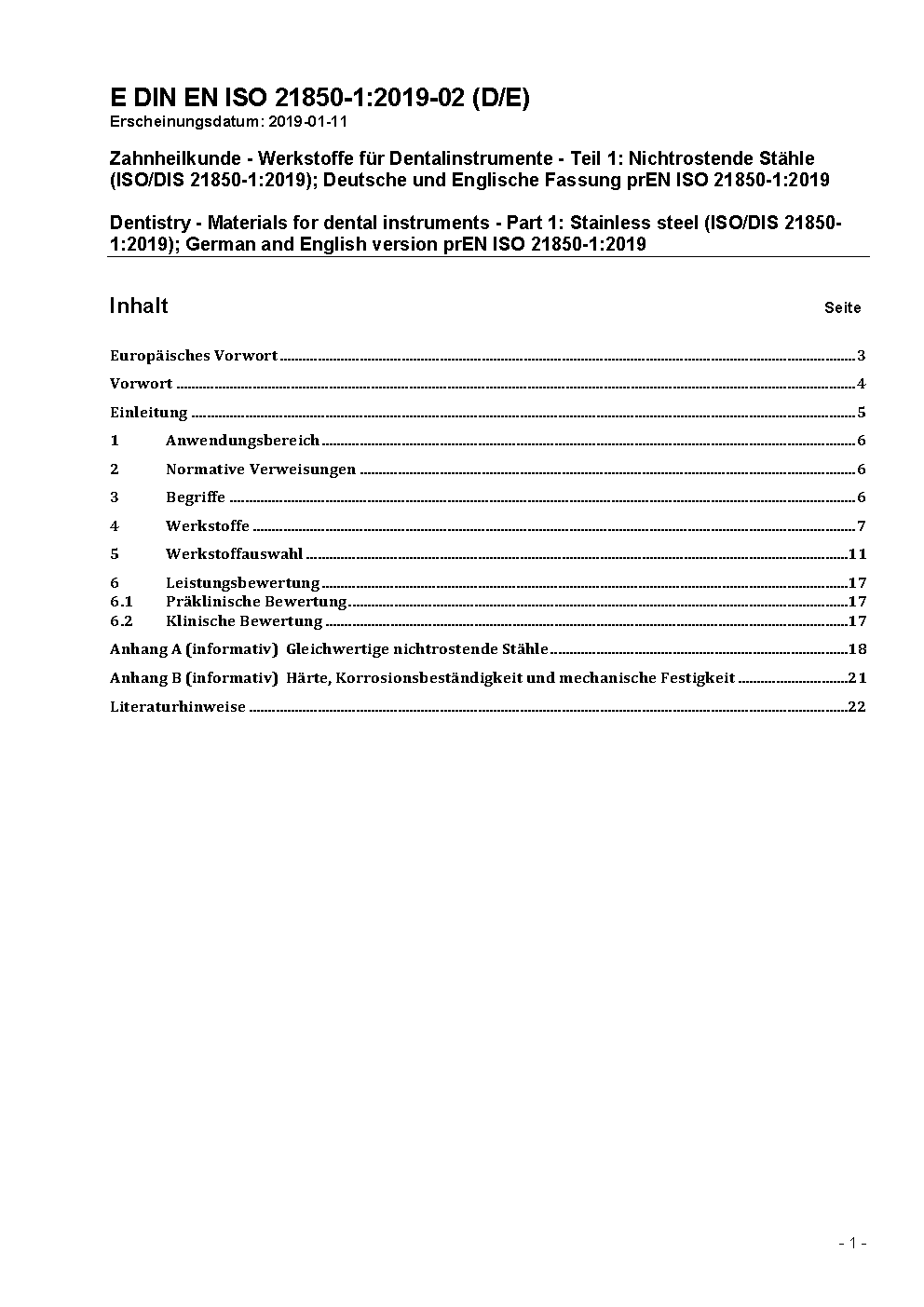 Zahnheilkunde - Werkstoffe für Dentalinstrumente - Teil 1: Nichtrostende Stähle (ISO/DIS 21850-1:2019); Deutsche und Englische Fassung prEN ISO 21850-1:2019