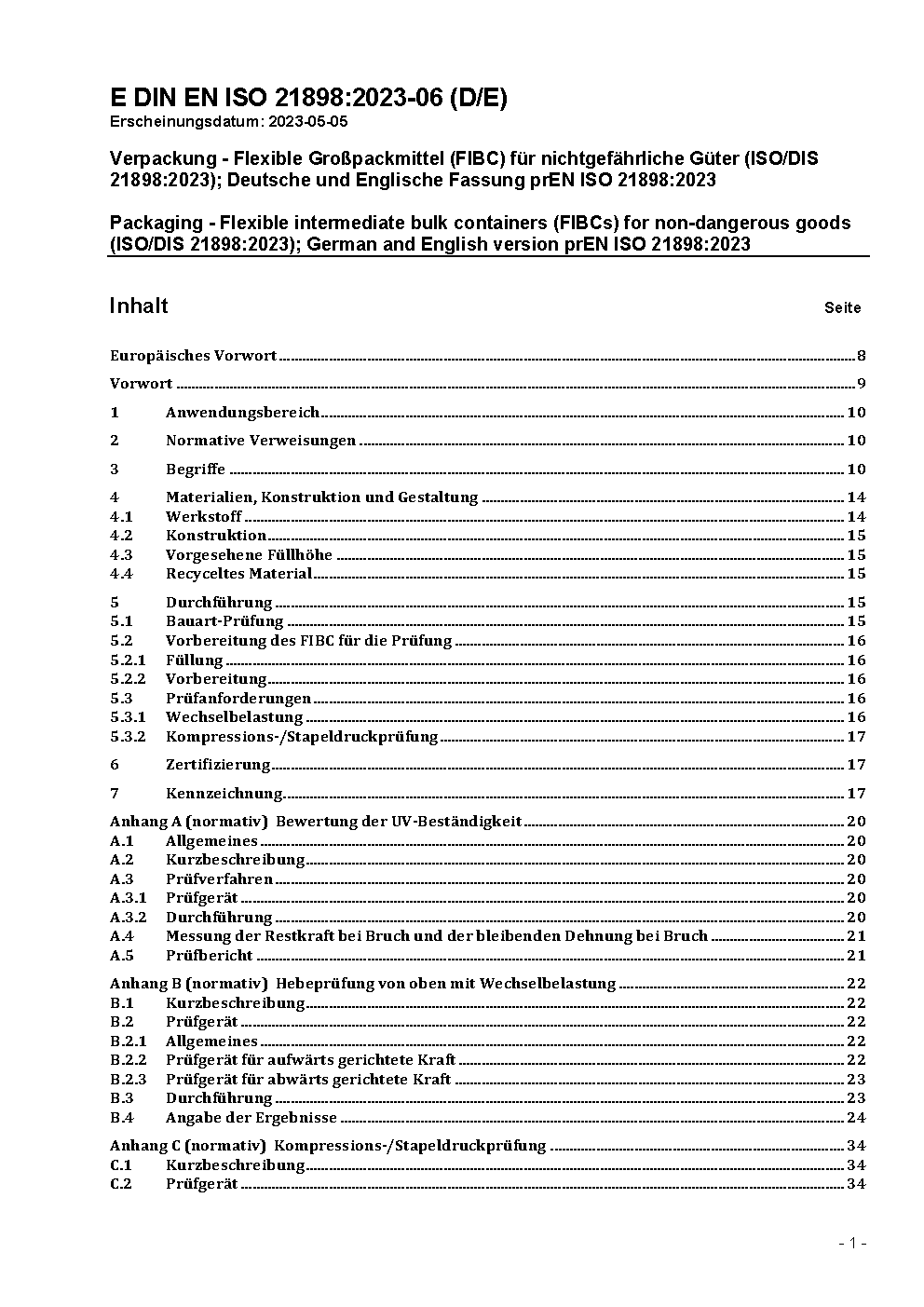 Packaging - Flexible intermediate bulk containers (FIBCs) for non-dangerous goods (ISO 21898:2004); German version EN ISO 21898:2005