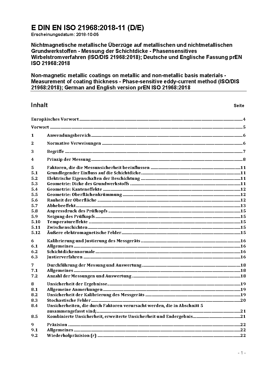 Nichtmagnetische metallische Überzüge auf metallischen und nichtmetallischen Grundwerkstoffen - Messung der Schichtdicke - Wirbelstromphasenwechselverfahren (ISO 21968:2005); Deutsche Fassung EN ISO 21968:2005