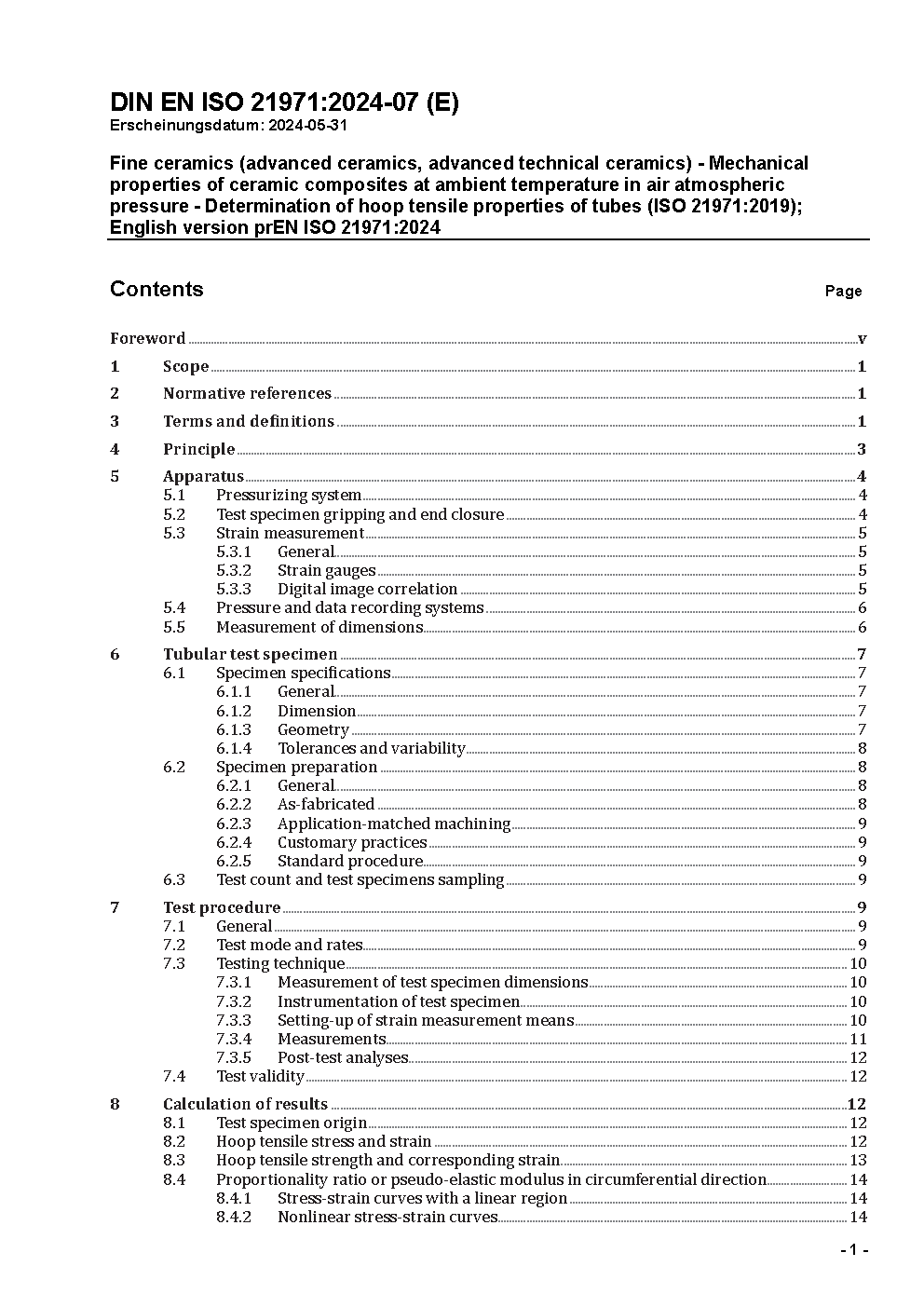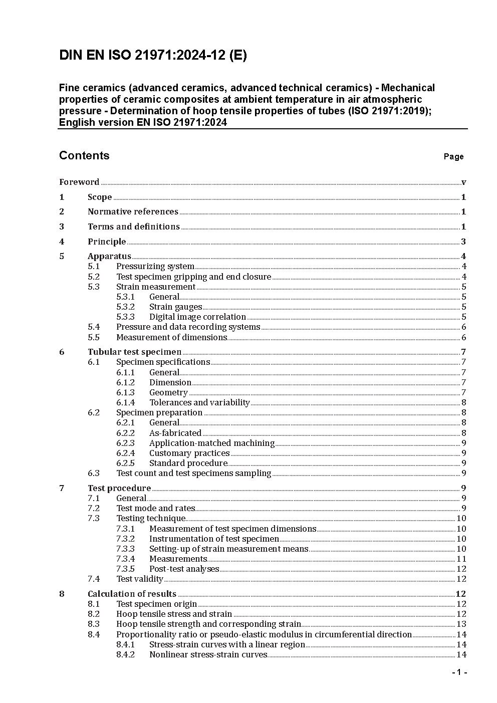 Fine ceramics (advanced ceramics, advanced technical ceramics) - Mechanical properties of ceramic composites at ambient temperature in air atmospheric pressure - Determination of hoop tensile properties of tubes (ISO 21971:2019); English version EN ISO 21971:2024