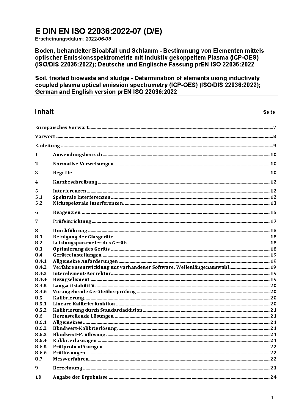 Environmental solid matrices - Determination of elements using inductively coupled plasma optical emission spectrometry (ICP-OES) (ISO 22036:2024); German version EN ISO 22036:2024