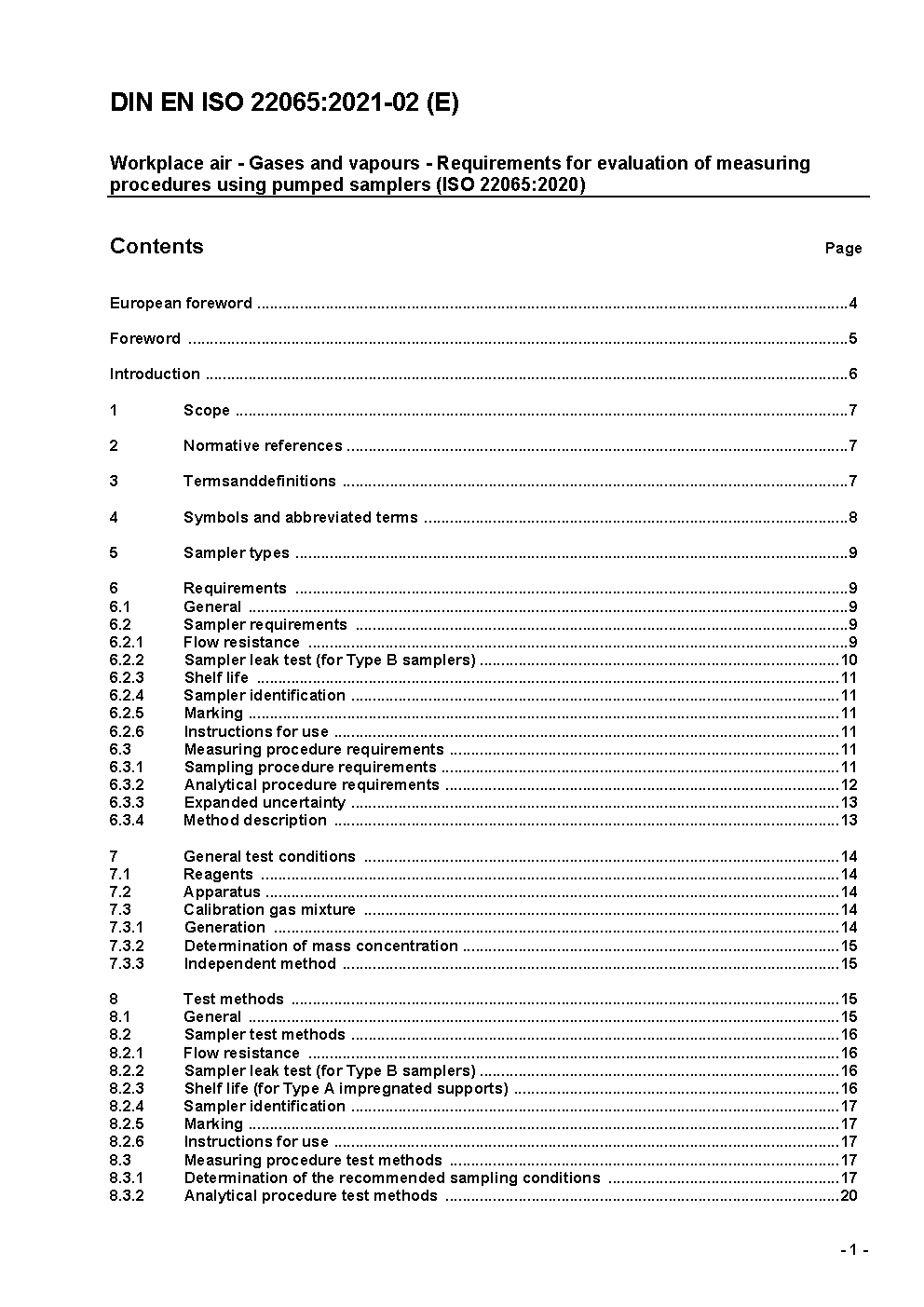 Workplace air - Gases and vapours - Requirements for evaluation of measuring procedures using pumped samplers (ISO 22065:2020); German version EN ISO 22065:2020