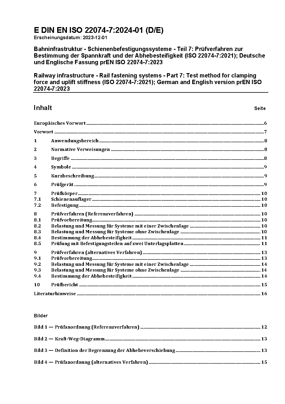 Bahninfrastruktur - Schienenbefestigungssysteme - Teil 7: Prüfverfahren zur Bestimmung der Spannkraft und der Abhebesteifigkeit (ISO 22074-7:2021); Deutsche Fassung EN ISO 22074-7:2024