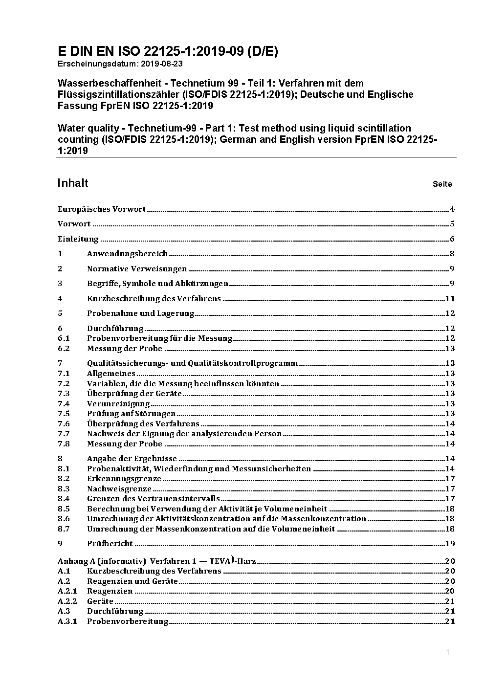 Wasserbeschaffenheit - Technetium 99 - Teil 1: Verfahren mit dem Flüssigszintillationszähler (ISO 22125-1:2019); Deutsche Fassung EN ISO 22125-1:2019