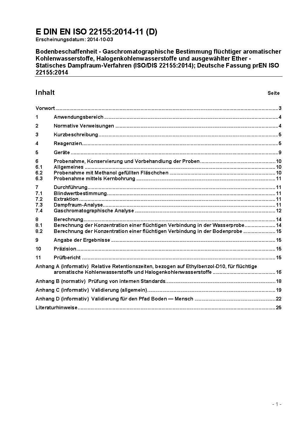 Bodenbeschaffenheit - Gaschromatographische Bestimmung flüchtiger aromatischer Kohlenwasserstoffe, Halogenkohlenwasserstoffe und ausgewählter Ether - Statisches Dampfraum-Verfahren (ISO 22155:2011); Deutsche Fassung EN ISO 22155:2013