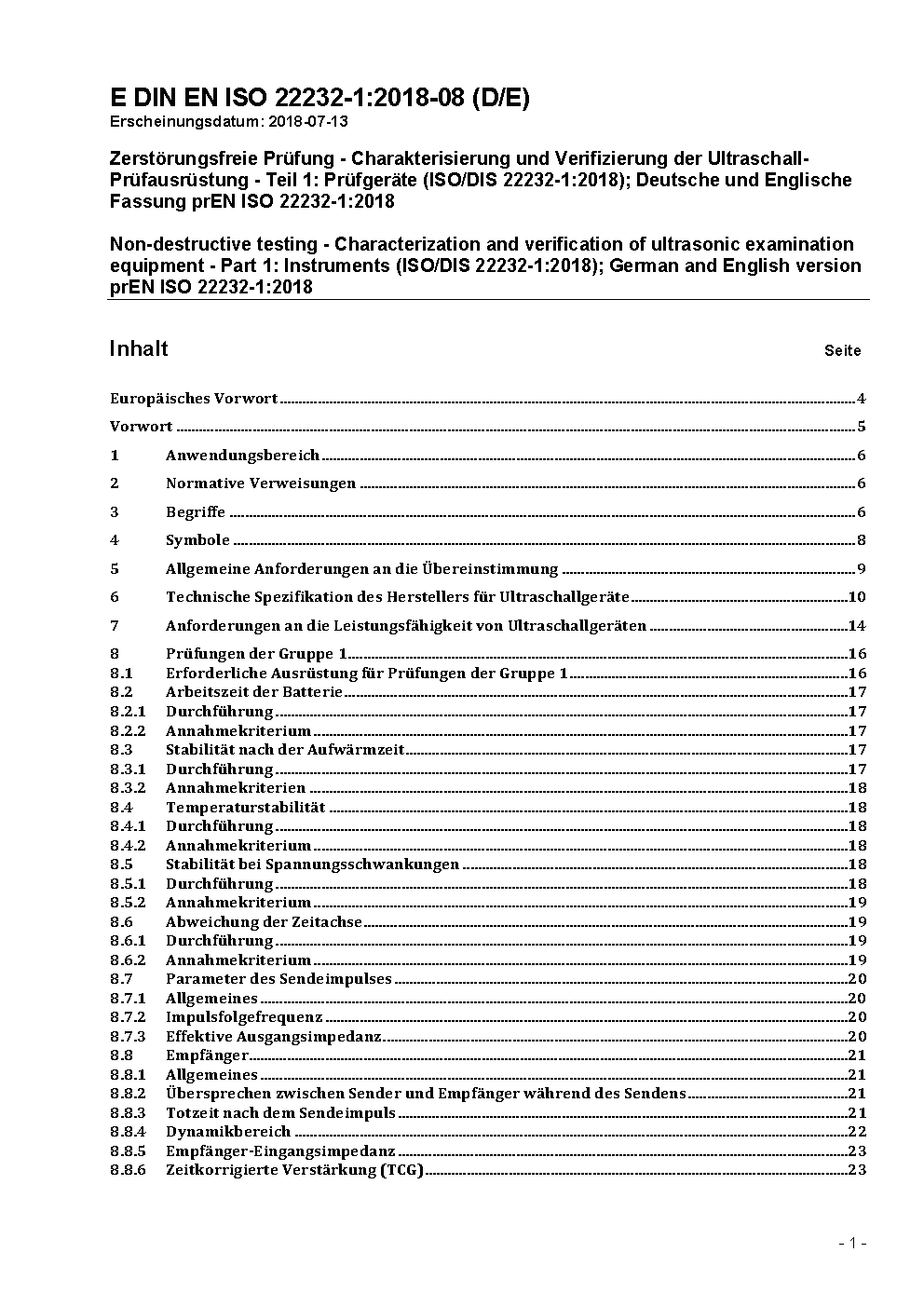 Zerstörungsfreie Prüfung - Charakterisierung und Verifizierung der Ultraschall-Prüfausrüstung - Teil 1: Prüfgeräte (ISO/DIS 22232-1:2018); Deutsche und Englische Fassung prEN ISO 22232-1:2018