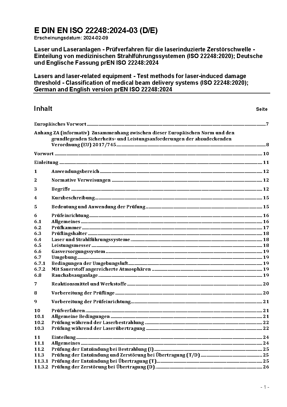 Laser und Laseranlagen - Prüfverfahren für die laserinduzierte Zerstörschwelle - Einteilung von medizinischen Strahlführungssystemen (ISO 22248:2020); Deutsche und Englische Fassung prEN ISO 22248:2024