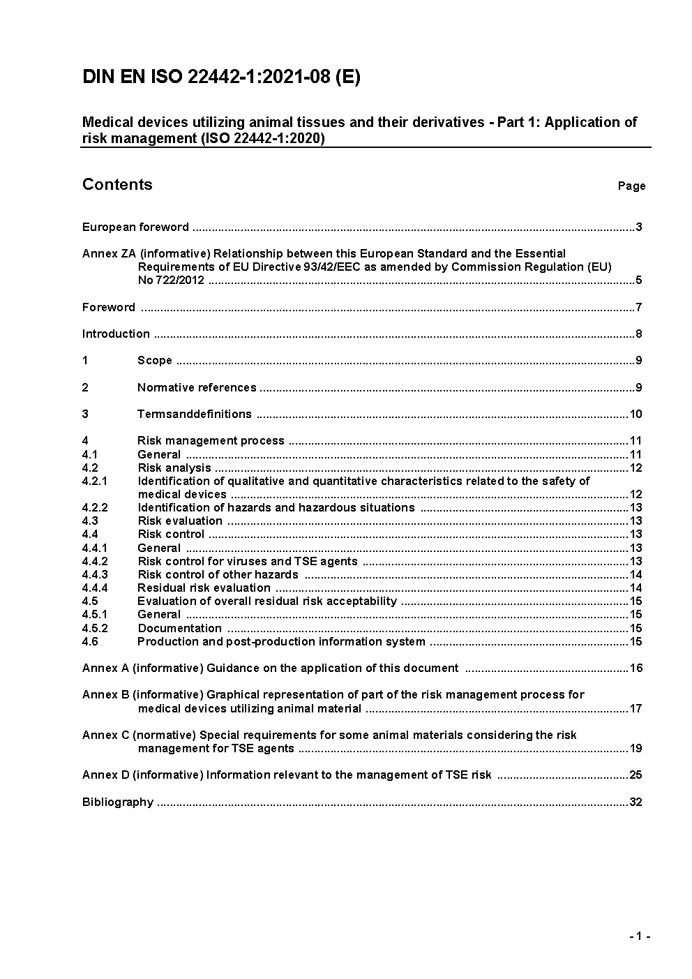 Tierische Gewebe und deren Derivate, die zur Herstellung von Medizinprodukten eingesetzt werden - Teil 1: Anwendung des Risikomanagements (ISO 22442-1:2020); Deutsche Fassung EN ISO 22442-1:2020 / Achtung: Gilt in Verbindung mit DIN EN ISO 14971 (2020-07)