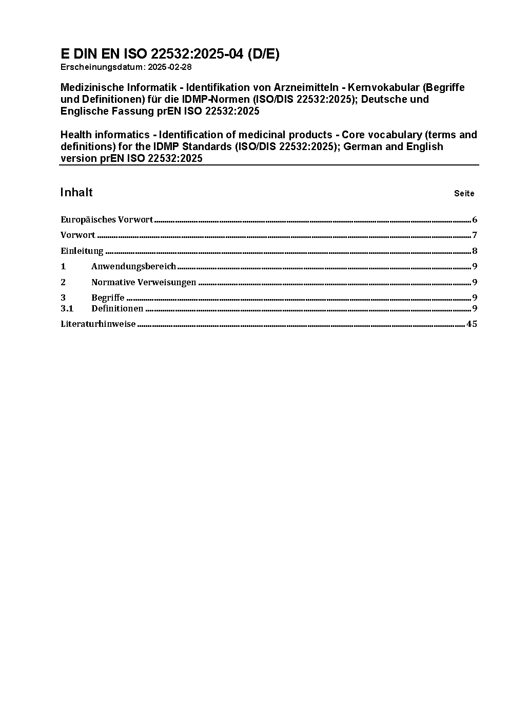Health informatics - Identification of medicinal products - Core vocabulary (terms and definitions) for the IDMP Standards (ISO/DIS 22532:2025); German and English version prEN ISO 22532:2025