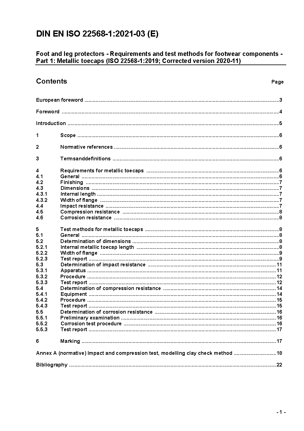 Foot and leg protectors - Requirements and test methods for footwear components assessment - Part 1: Metallic toecaps (ISO/DIS 22568-1:2017); German and English version prEN ISO 22568-1:2017