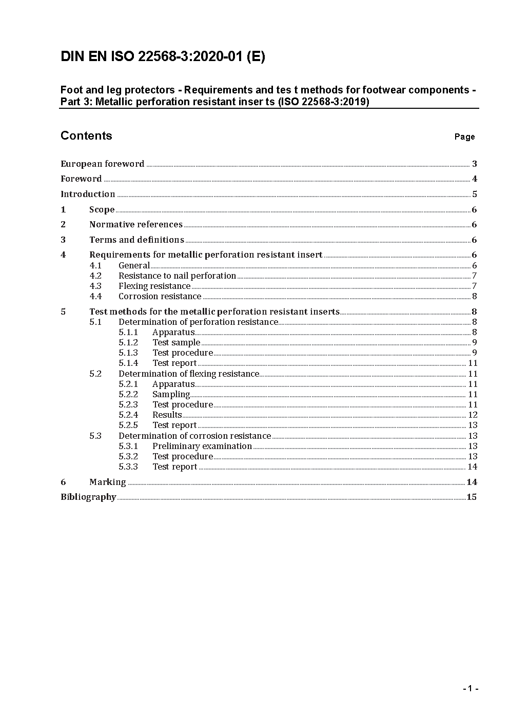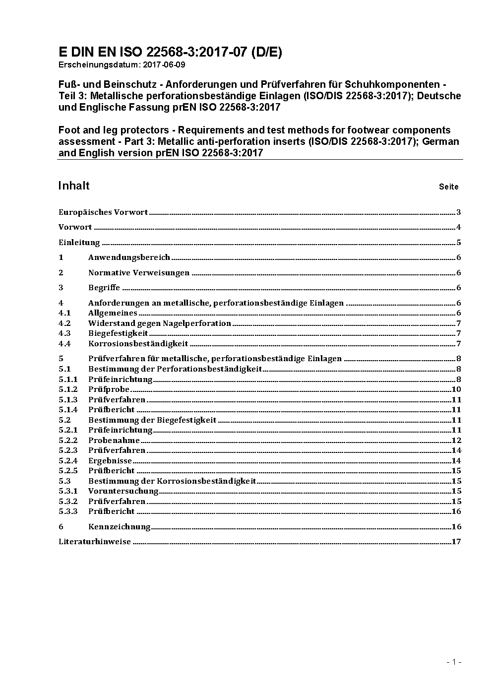Foot and leg protectors - Requirements and test methods for footwear components assessment - Part 3: Metallic anti-perforation inserts (ISO/DIS 22568-3:2017); German and English version prEN ISO 22568-3:2017