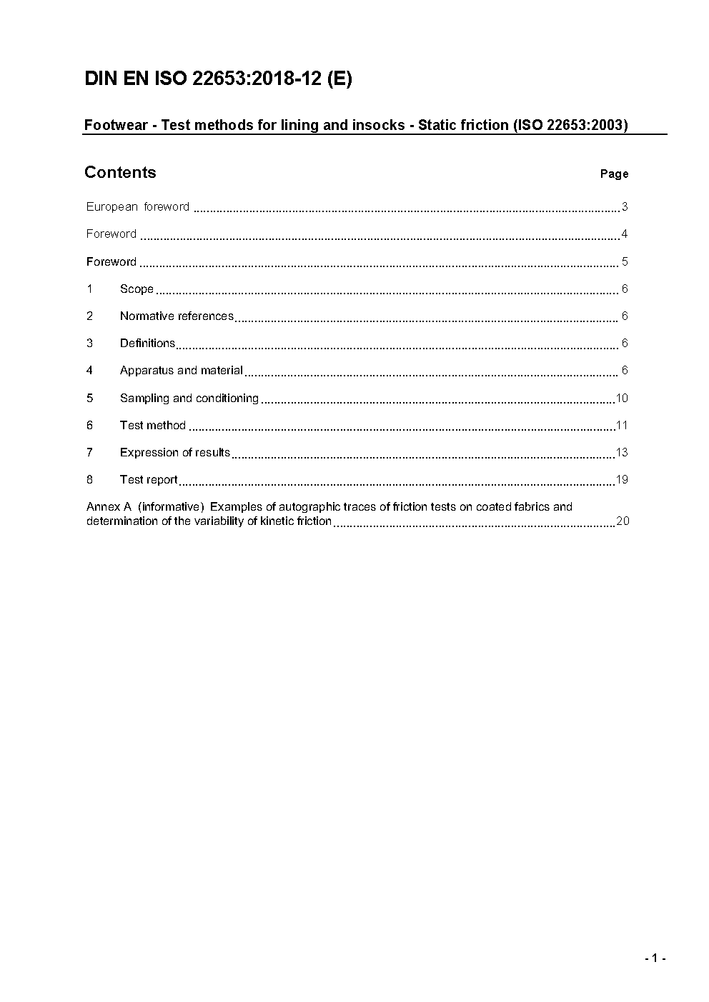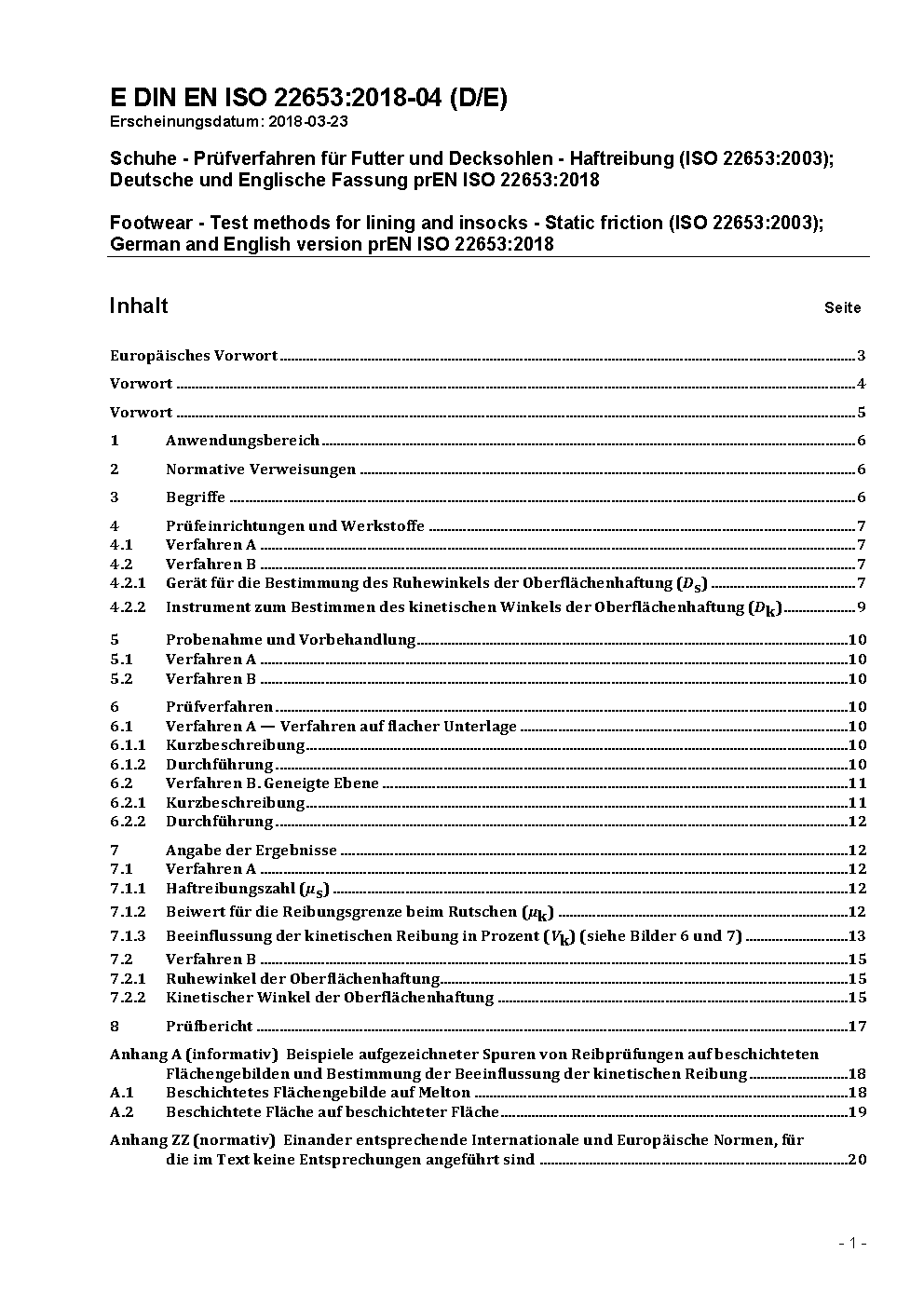 Footwear - Test methods for lining and insocks - Static friction (ISO 22653:2003); German and English version prEN ISO 22653:2018
