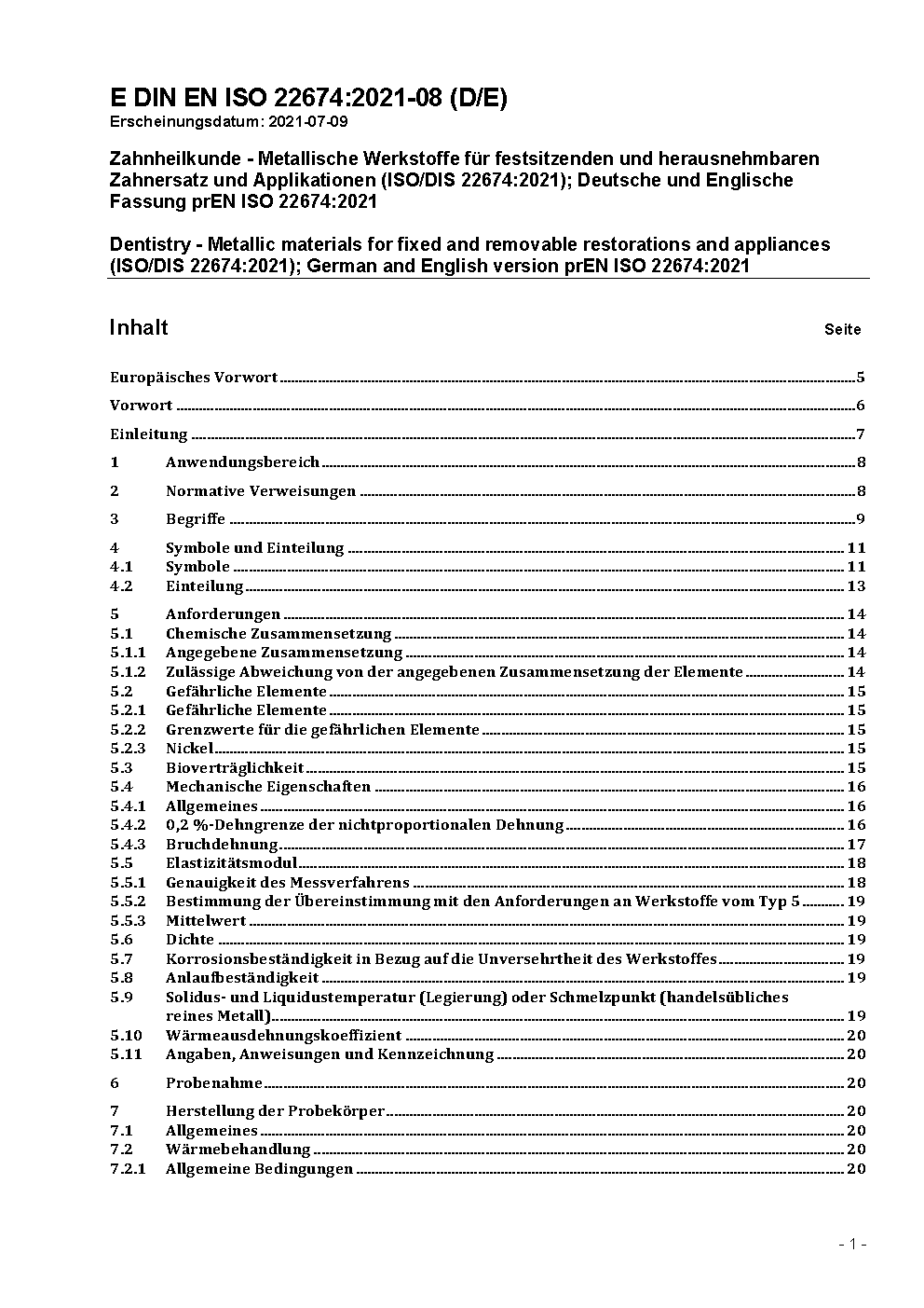 Zahnheilkunde - Metallische Werkstoffe für festsitzenden und herausnehmbaren Zahnersatz und Applikationen (ISO/DIS 22674:2021); Deutsche und Englische Fassung prEN ISO 22674:2021