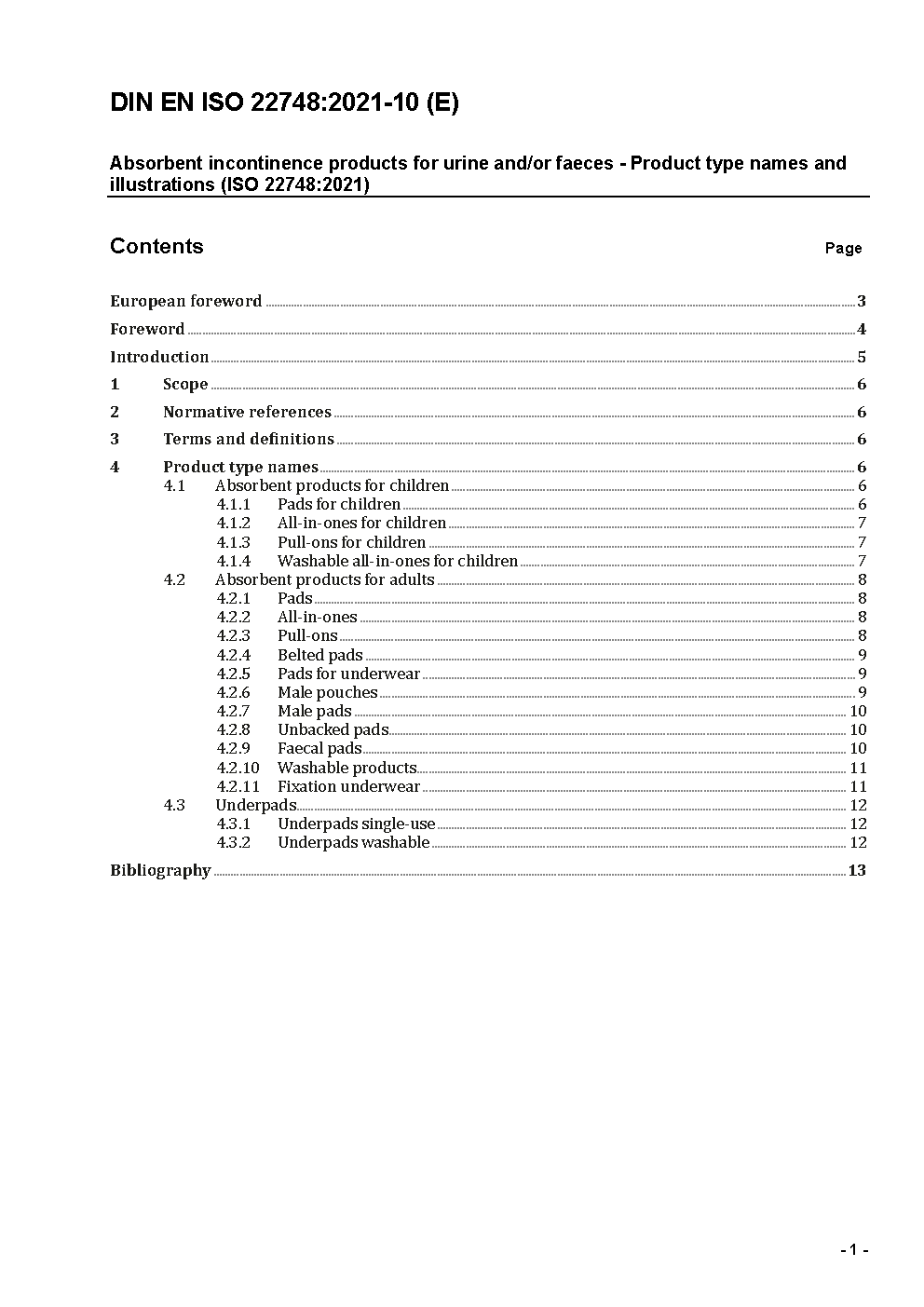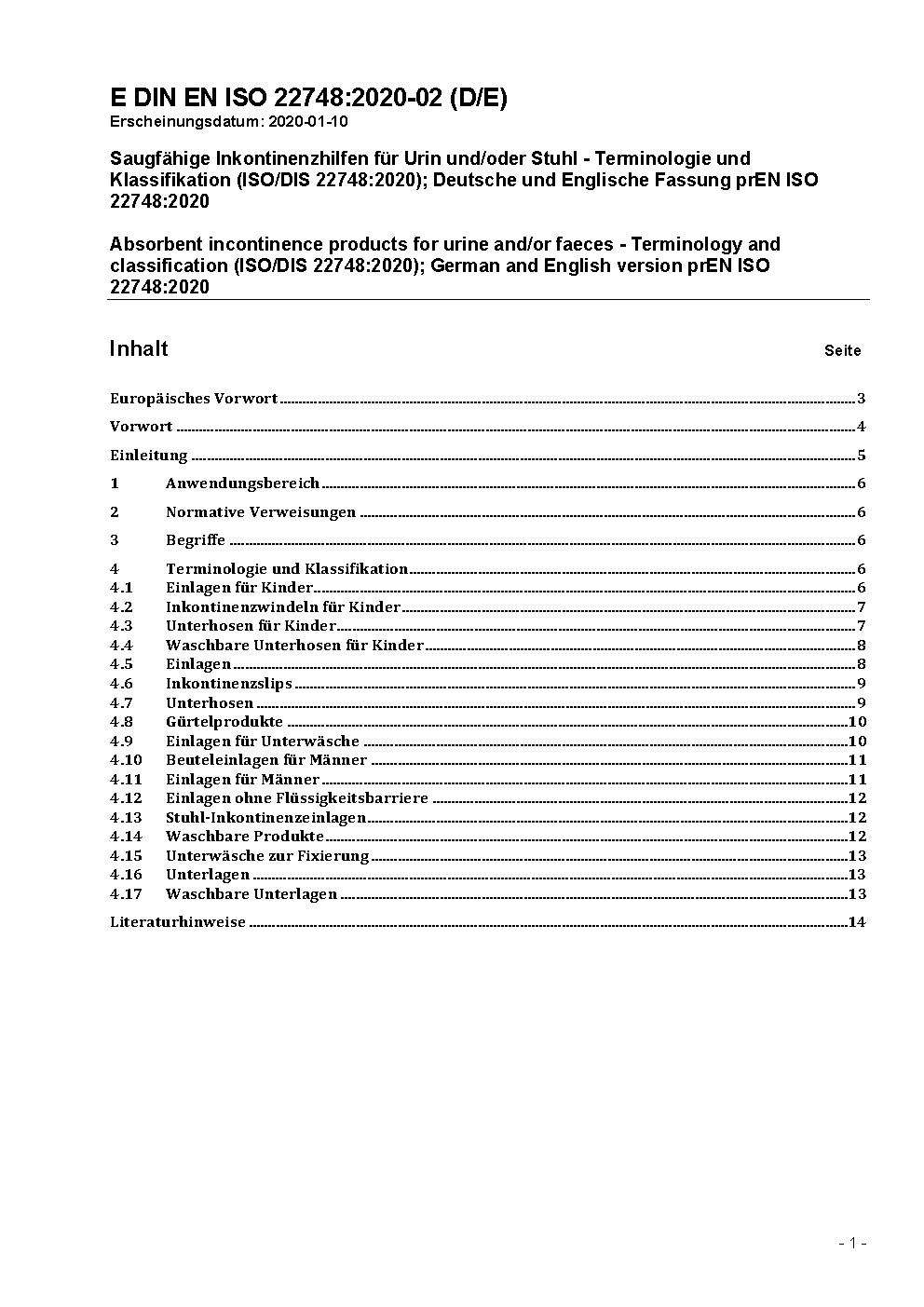 Saugfähige Inkontinenzhilfen für Urin und/oder Stuhl - Terminologie und Klassifikation (ISO/DIS 22748:2020); Deutsche und Englische Fassung prEN ISO 22748:2020