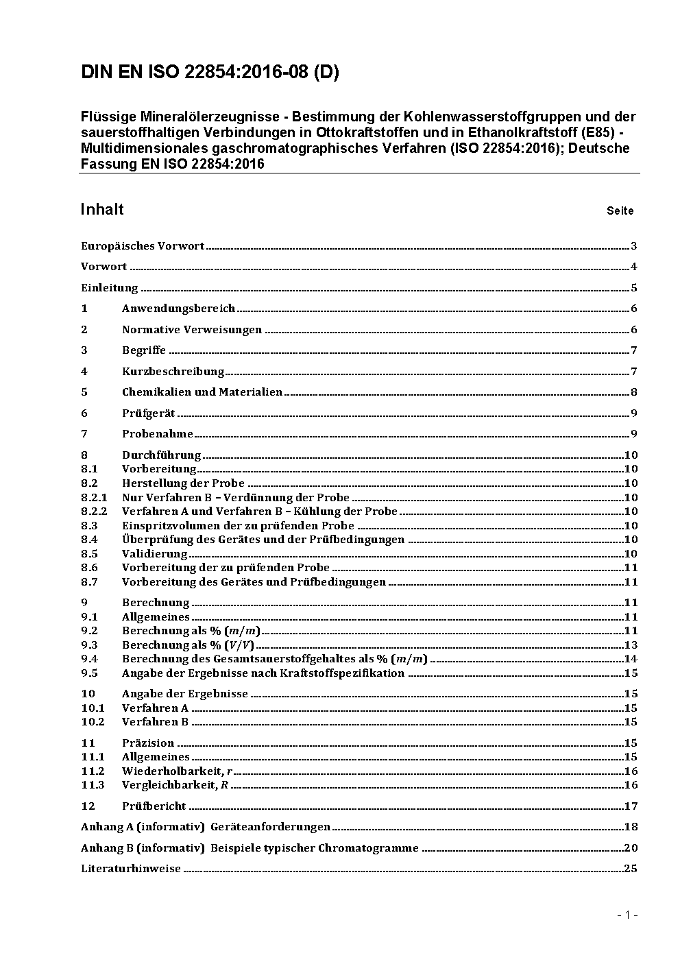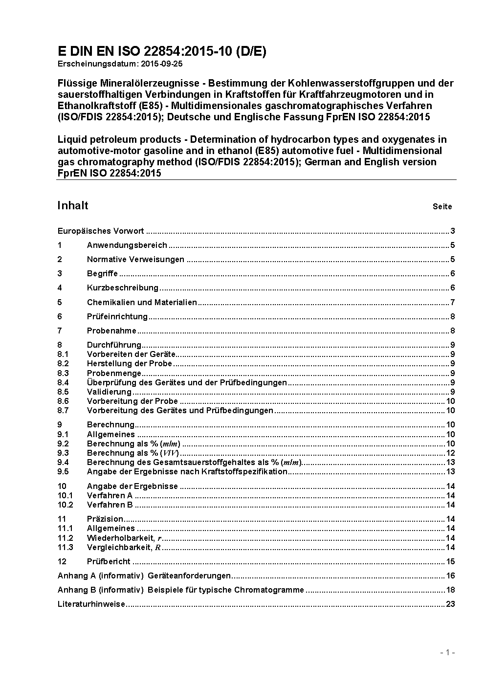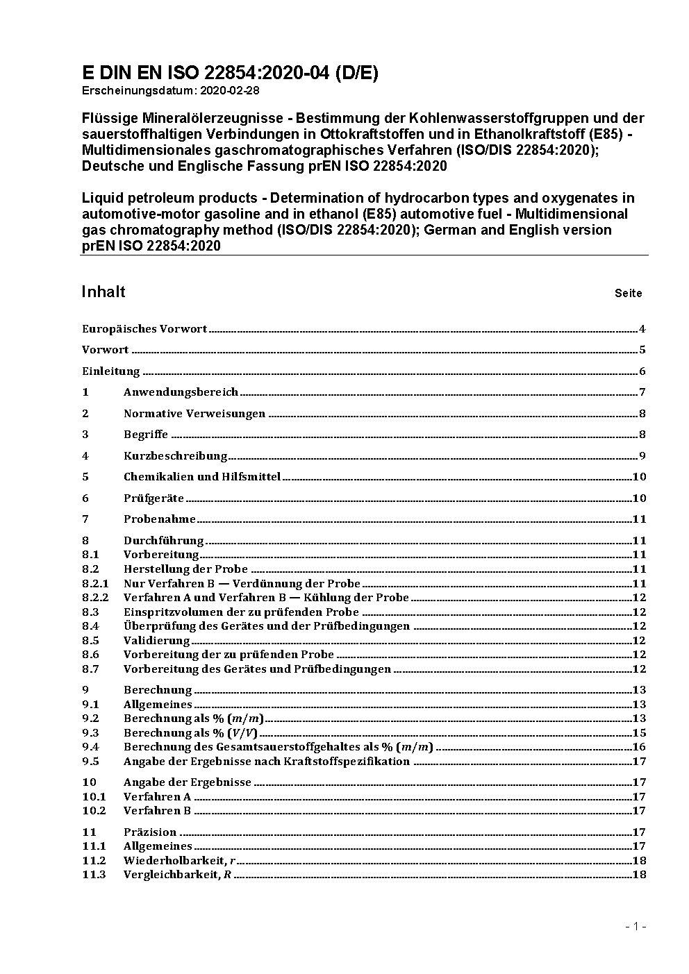 Flüssige Mineralölerzeugnisse - Bestimmung der Kohlenwasserstoffgruppen und der sauerstoffhaltigen Verbindungen in Kraftstoffen für Kraftfahrzeugmotoren - Multidimensionales gaschromatographisches Verfahren (ISO/DIS 22854); Deutsche Fassung prEN ISO 22854:2012