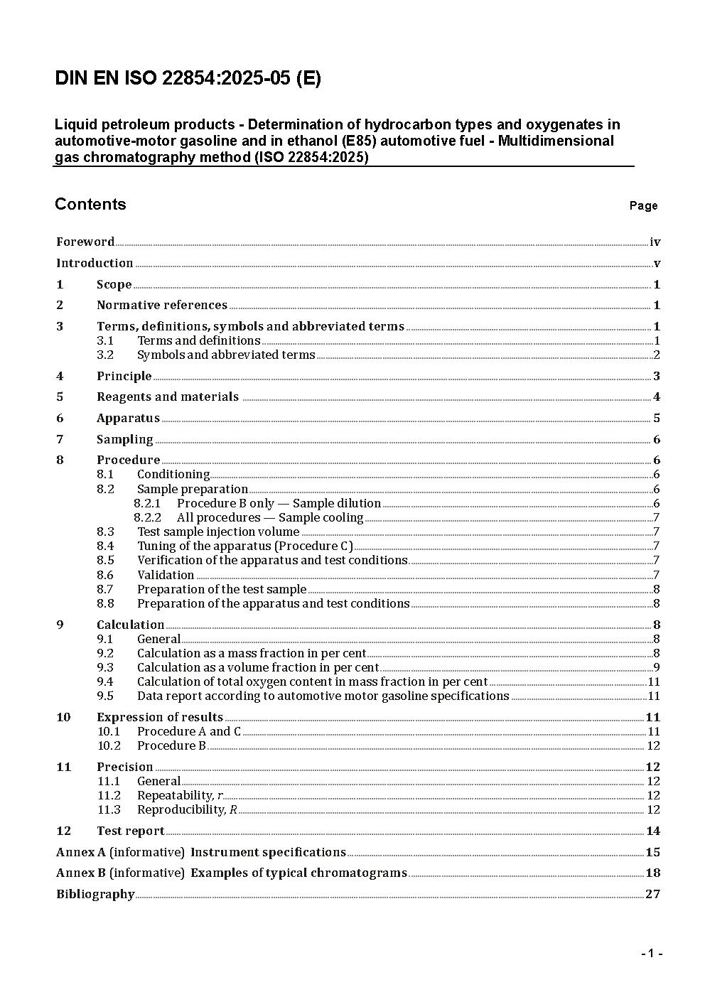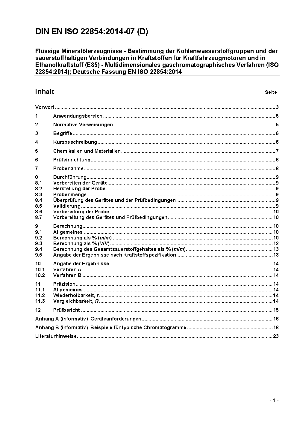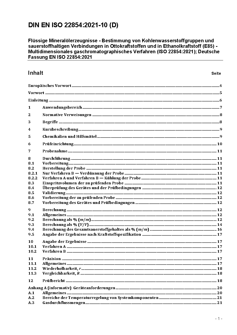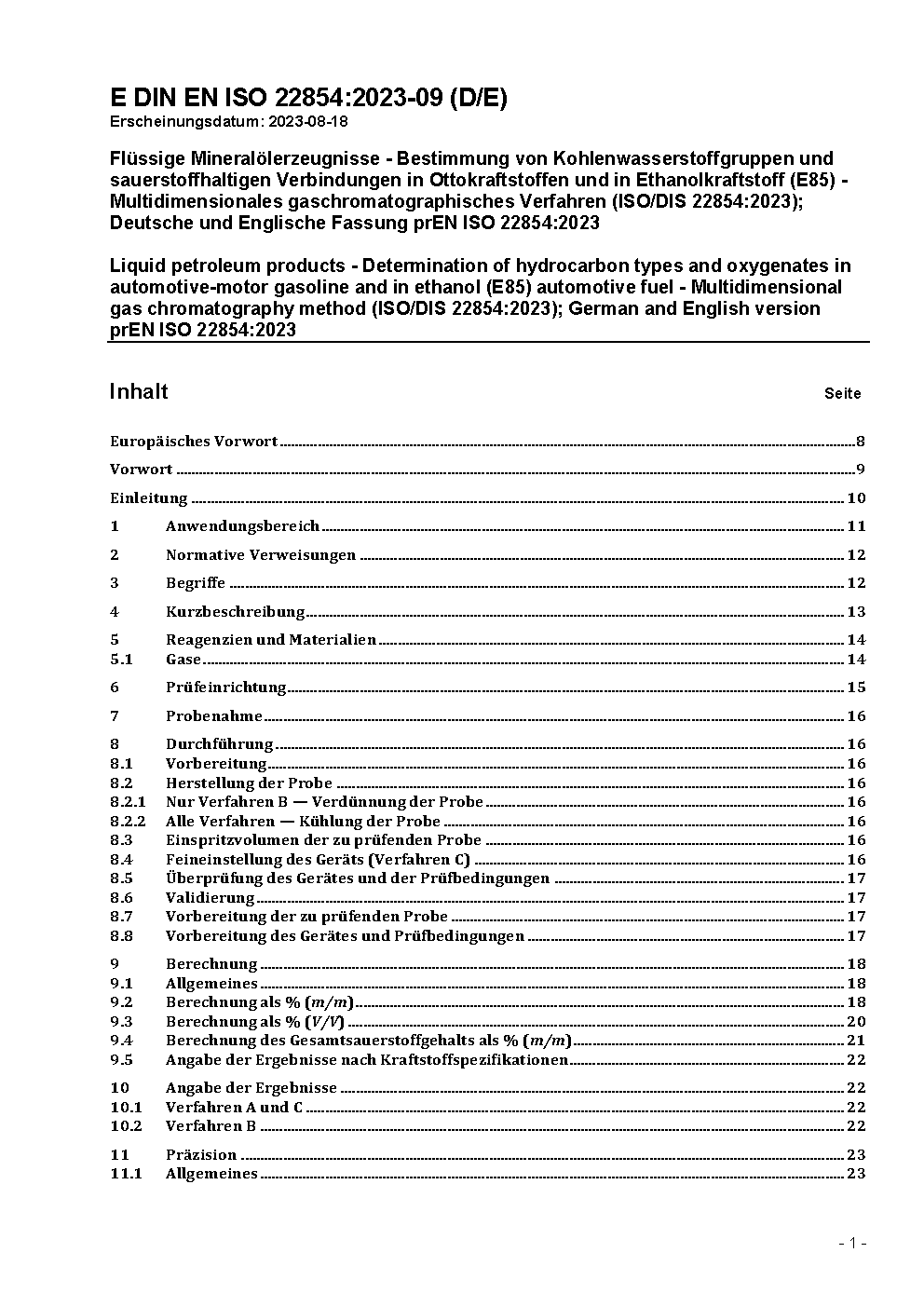 Flüssige Mineralölerzeugnisse - Bestimmung der Kohlenwasserstoffgruppen und der sauerstoffhaltigen Verbindungen in Kraftstoffen für Kraftfahrzeugmotoren - Multidimensionales gaschromatographisches Verfahren (ISO/DIS 22854); Deutsche Fassung prEN ISO 22854:2012