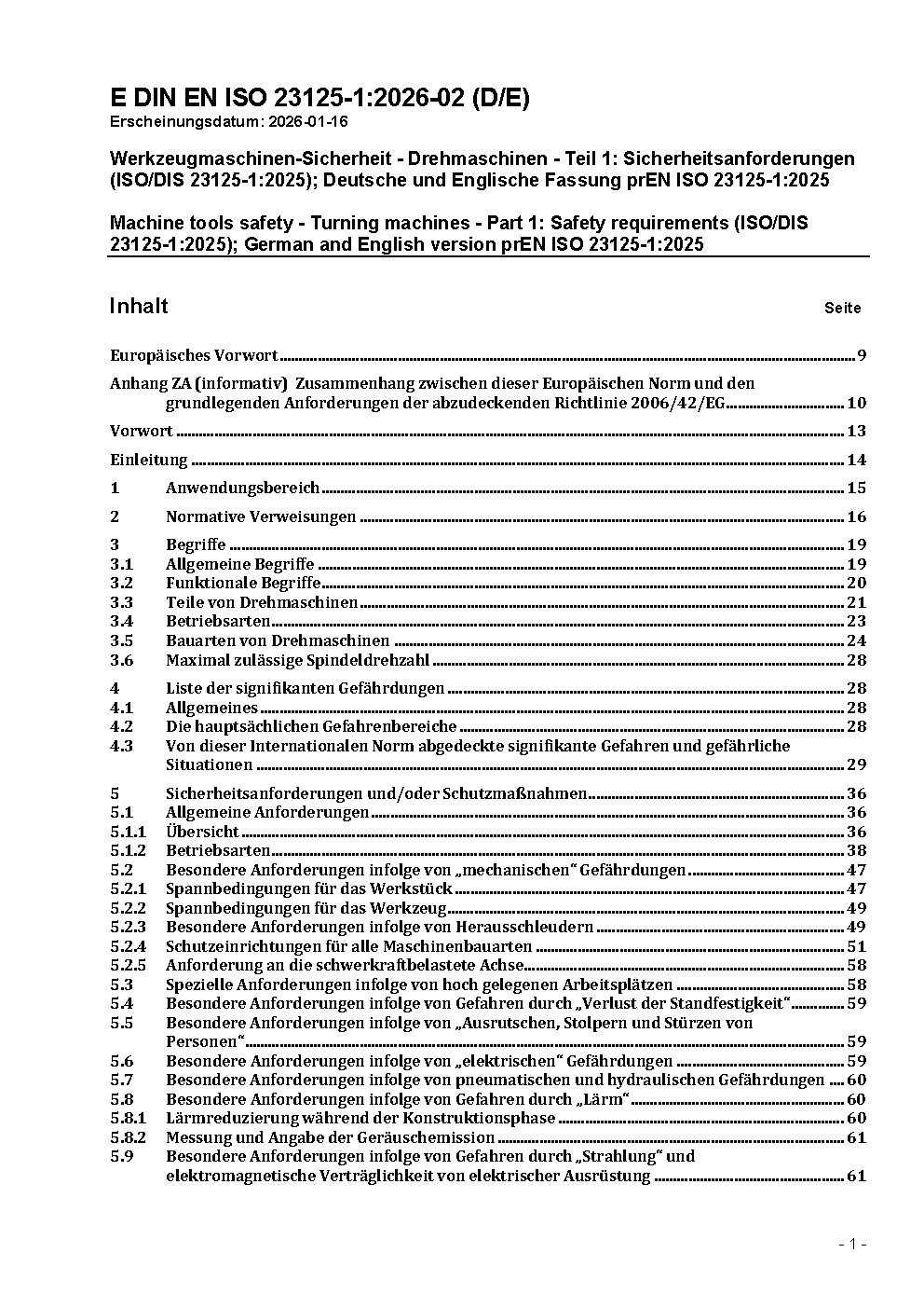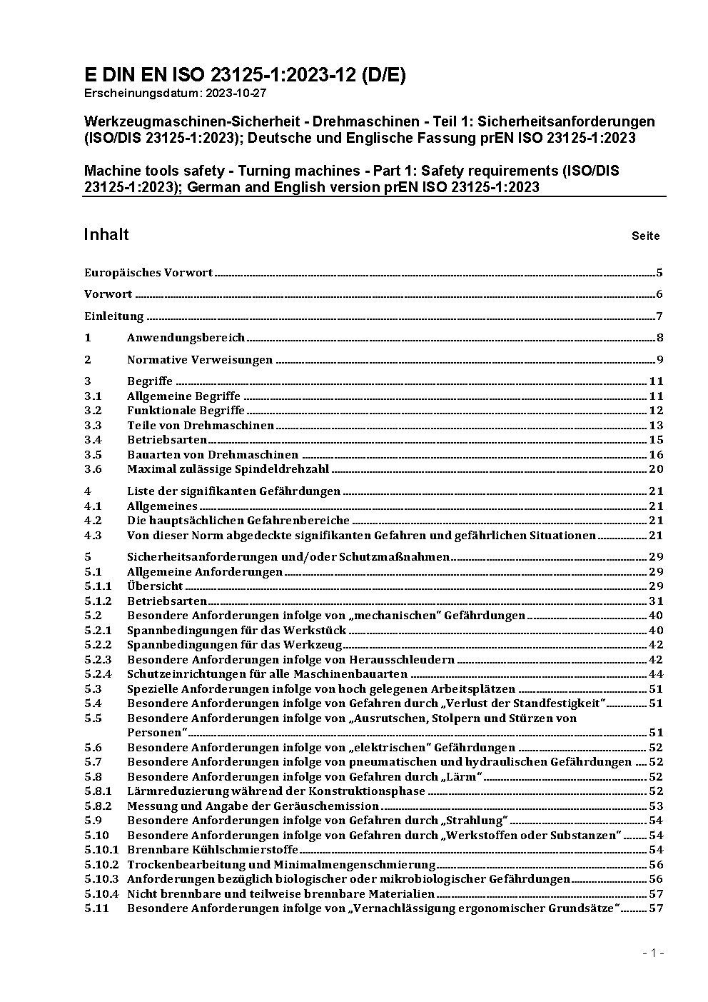 Machine tools safety - Turning machines - Part 1: Safety requirements (ISO/DIS 23125-1:2023); German and English version prEN ISO 23125-1:2023