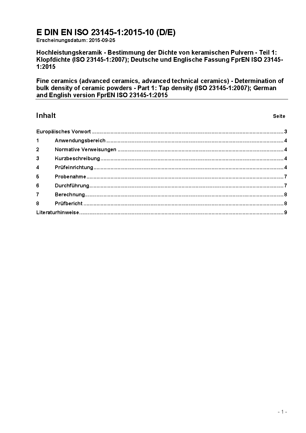Hochleistungskeramik - Bestimmung der Dichte von keramischen Pulvern - Teil 1: Klopfdichte (ISO 23145-1:2007); Deutsche Fassung EN ISO 23145-1:2016