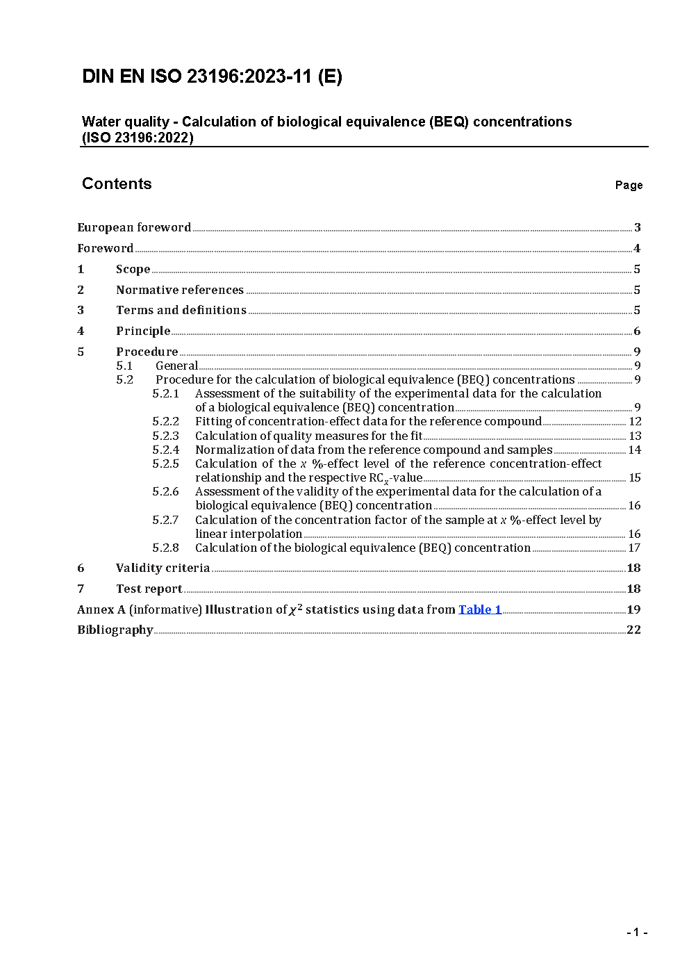 Water quality - Calculation of biological equivalence (BEQ) concentrations (ISO 23196:2022); German version EN ISO 23196:2023