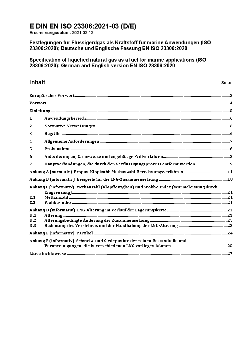 Specification of liquefied natural gas as a fuel for marine applications (ISO 23306:2020); German version EN ISO 23306:2020