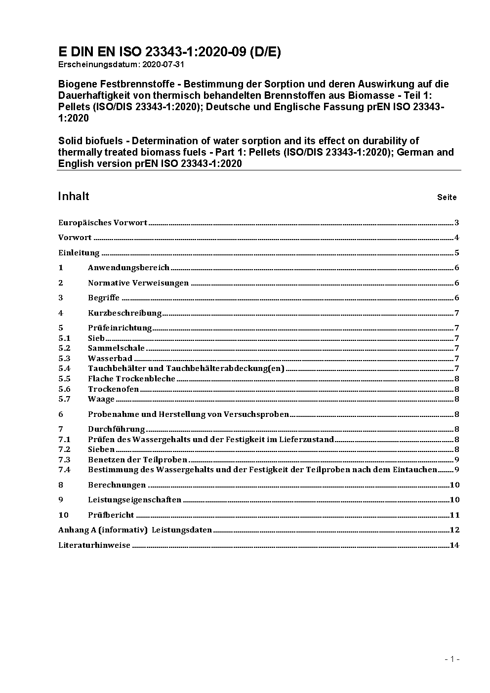 Biogene Festbrennstoffe - Bestimmung der Wasseraufnahme und deren Auswirkung auf die Festigkeit von Brennstoffen aus thermisch behandelter Biomasse - Teil 1: Pellets (ISO 23343-1:2021); Deutsche Fassung EN ISO 23343-1:2021
