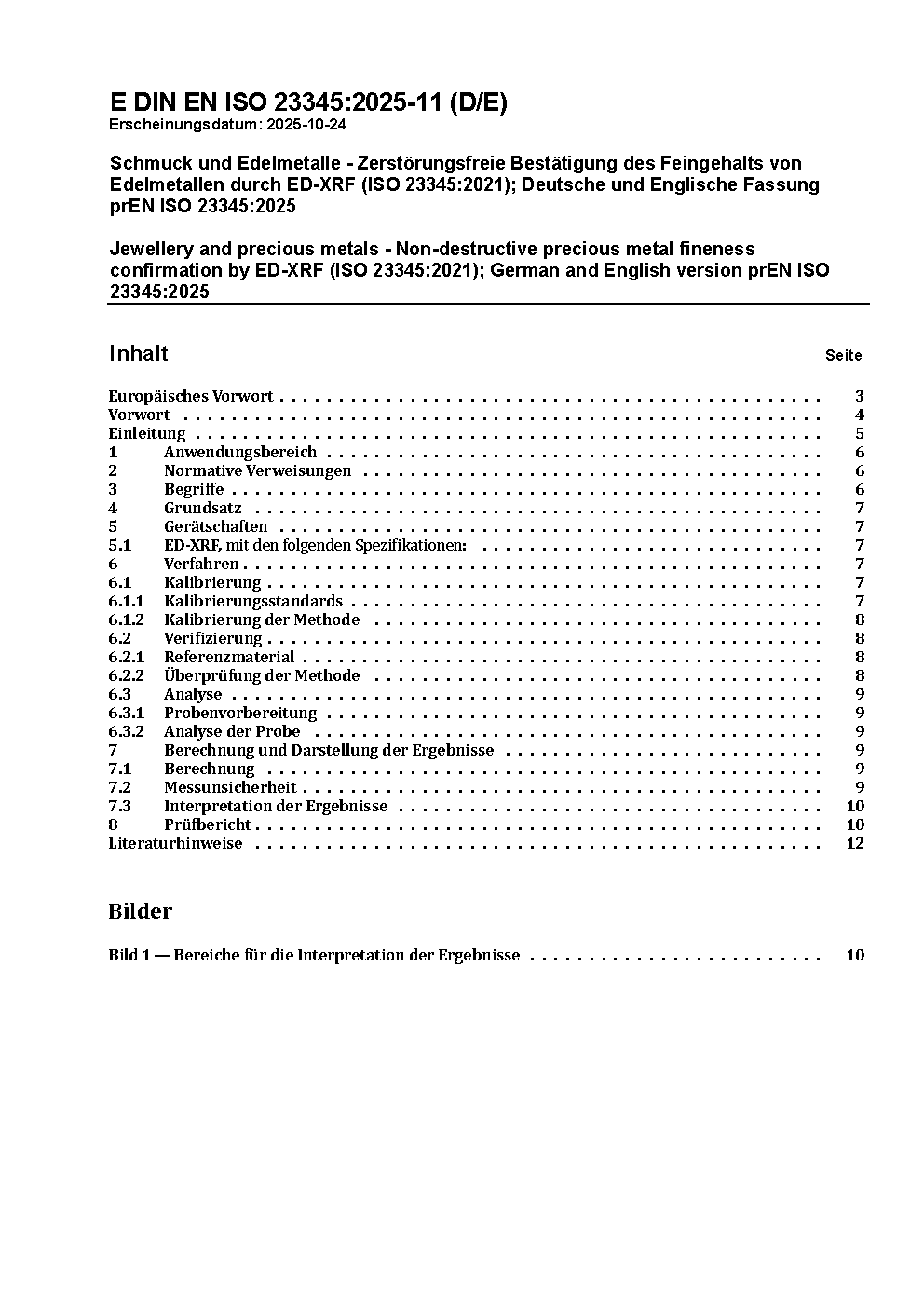 Schmuck und Edelmetalle - Zerstörungsfreie Bestätigung des Feingehalts von Edelmetallen durch ED-XRF (ISO 23345:2021); Deutsche und Englische Fassung prEN ISO 23345:2025