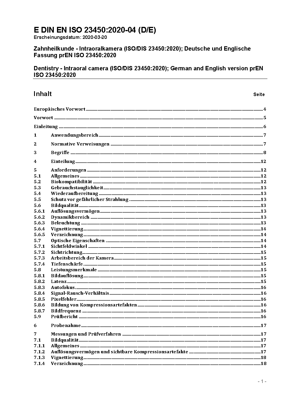 Zahnheilkunde - Intraoralkamera (ISO 23450:2021); Deutsche Fassung EN ISO 23450:2021