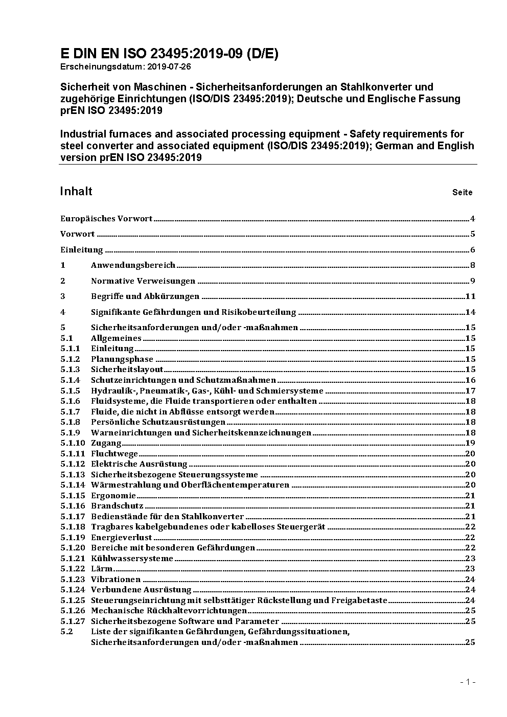 Sicherheit von Maschinen - Sicherheitsanforderungen an Stahlkonverter und zugehörige Einrichtungen (ISO/DIS 23495:2019); Deutsche und Englische Fassung prEN ISO 23495:2019