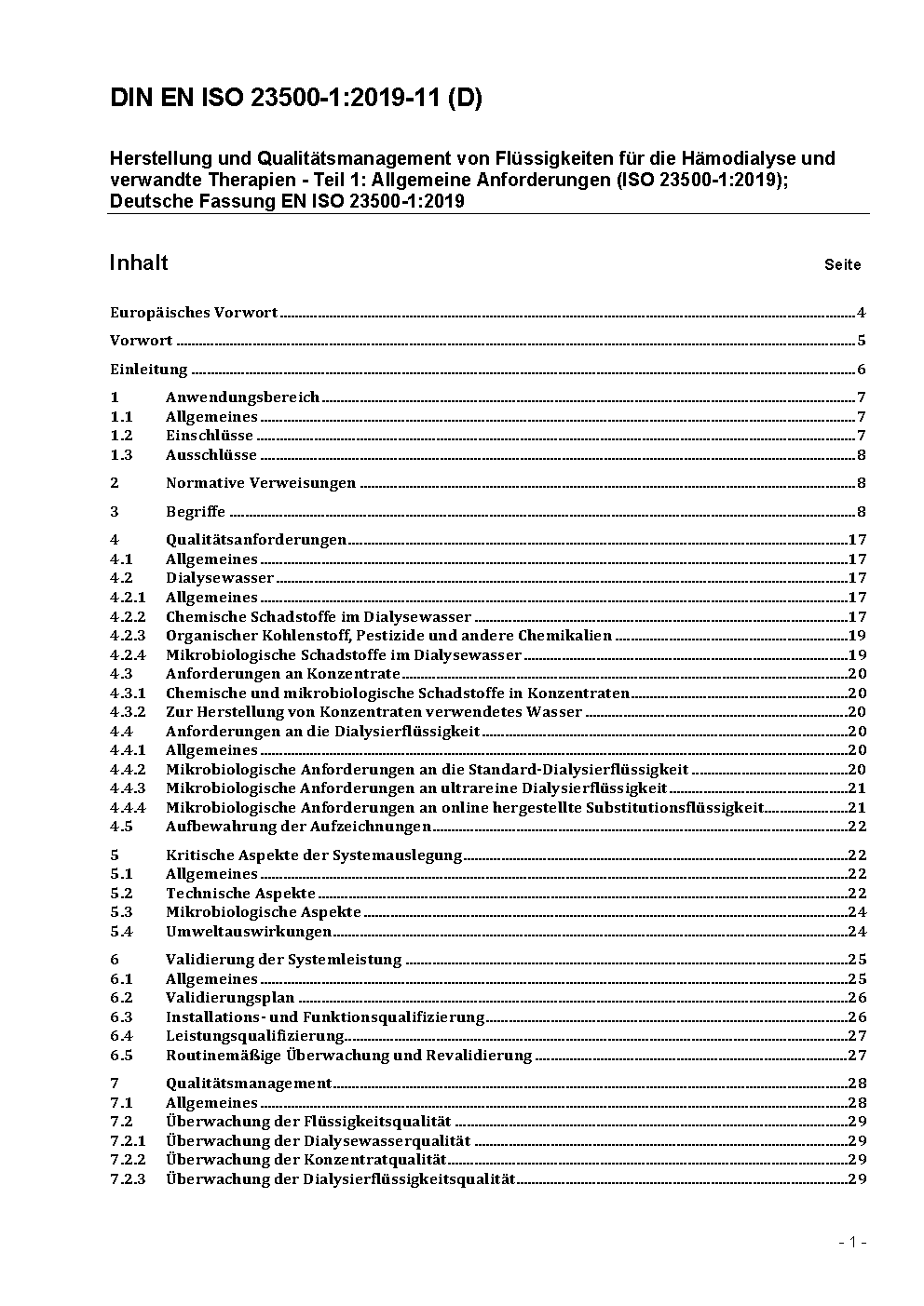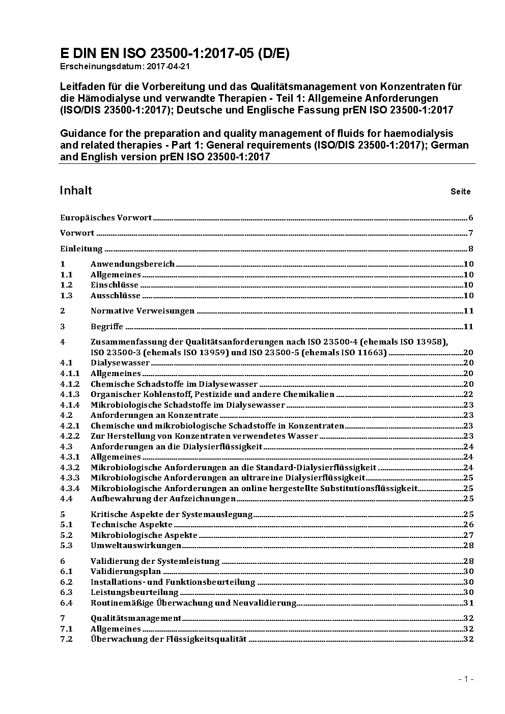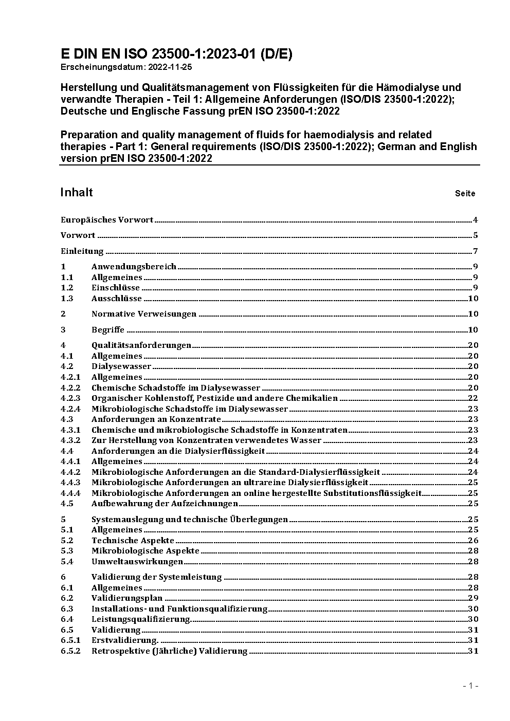 Preparation and quality management of fluids for haemodialysis and related therapies - Part 1: General requirements (ISO/DIS 23500-1:2022); German and English version prEN ISO 23500-1:2022