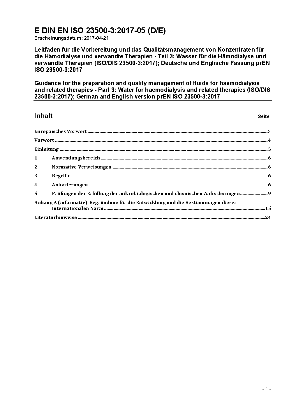 Herstellung und Qualitätsmanagement von Flüssigkeiten für die Hämodialyse und verwandte Therapien - Teil 3: Wasser für die Hämodialyse und verwandte Therapien (ISO 23500-3:2024); Deutsche Fassung EN ISO 23500-3:2024