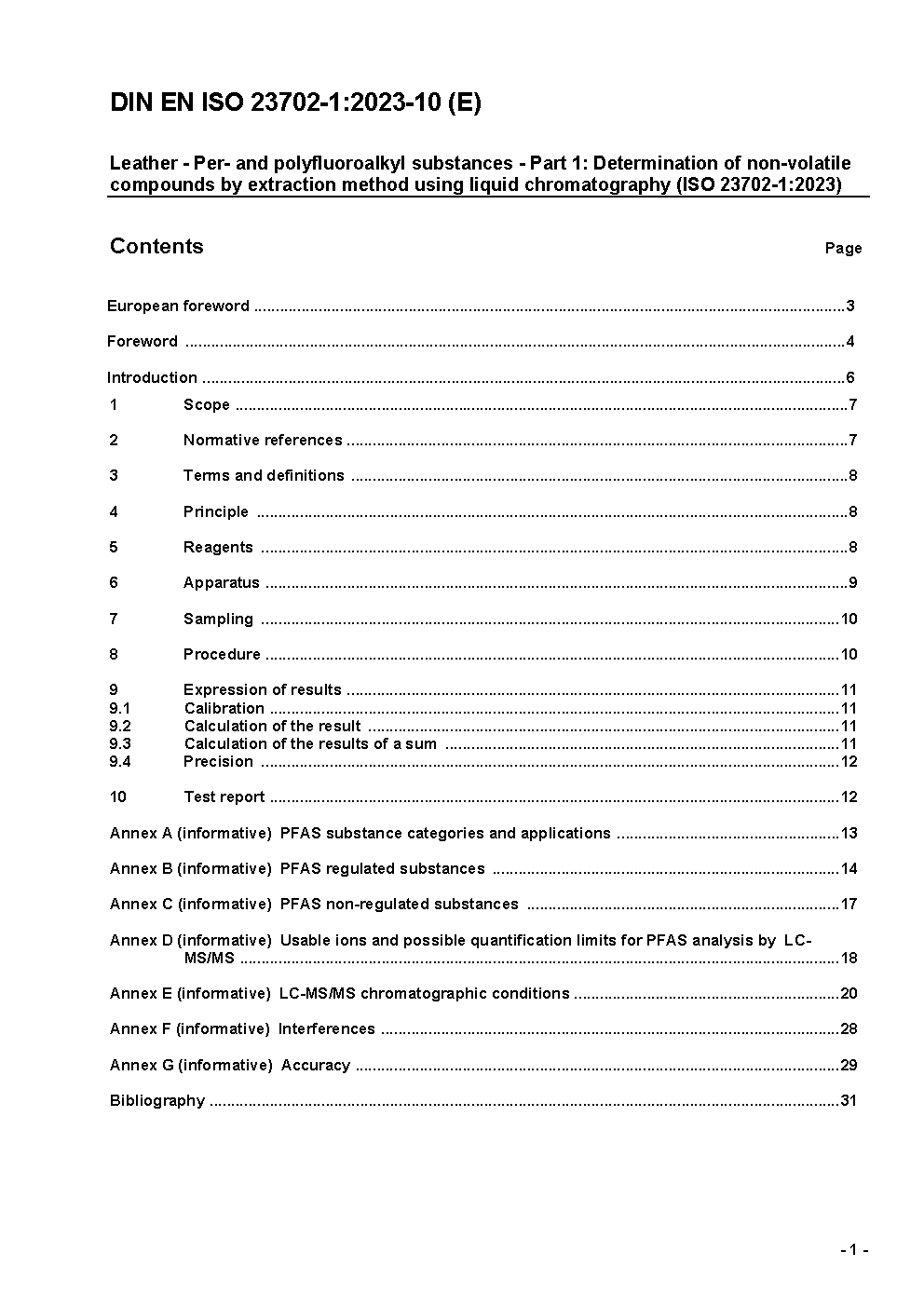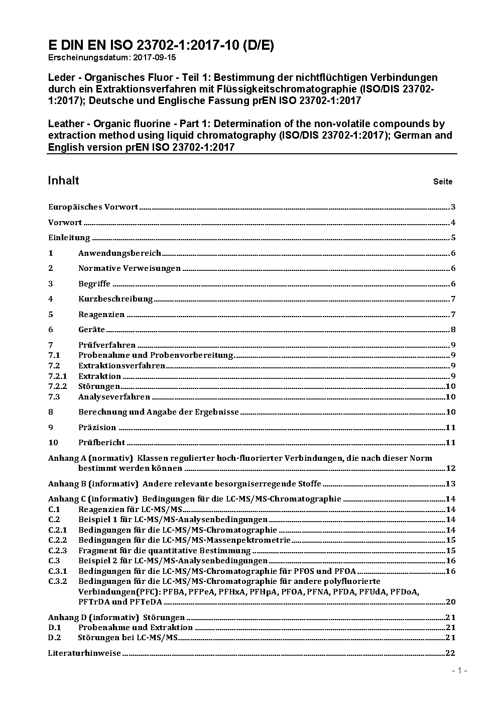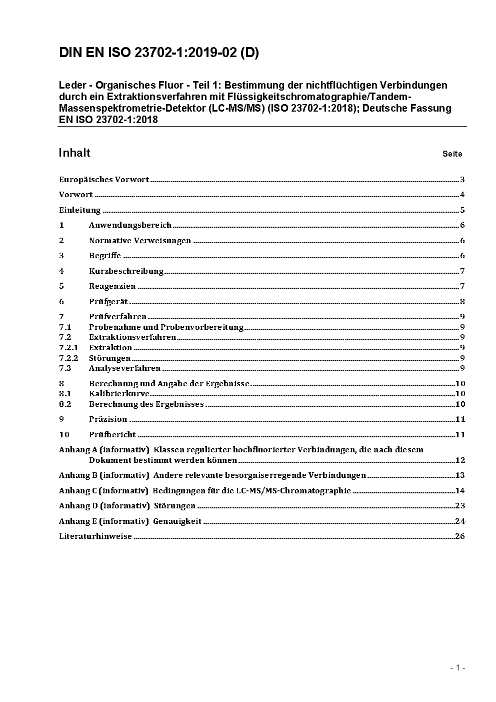 Leather - Per- and polyfluoroalkyl substances - Part 1: Determination of non-volatile compounds by extraction method using liquid chromatography (ISO 23702-1:2023); German version EN ISO 23702-1:2023
