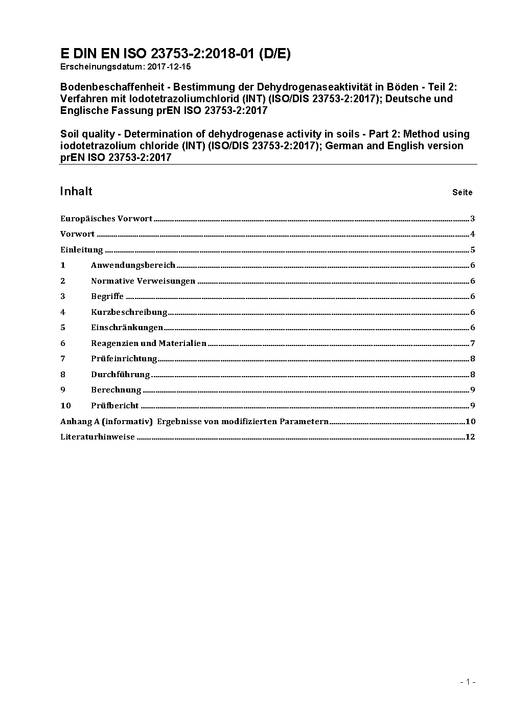 Bodenbeschaffenheit - Bestimmung der Dehydrogenaseaktivität in Böden - Teil 2: Verfahren mit Iodotetrazoliumchlorid (INT) (ISO/DIS 23753-2:2017); Deutsche und Englische Fassung prEN ISO 23753-2:2017
