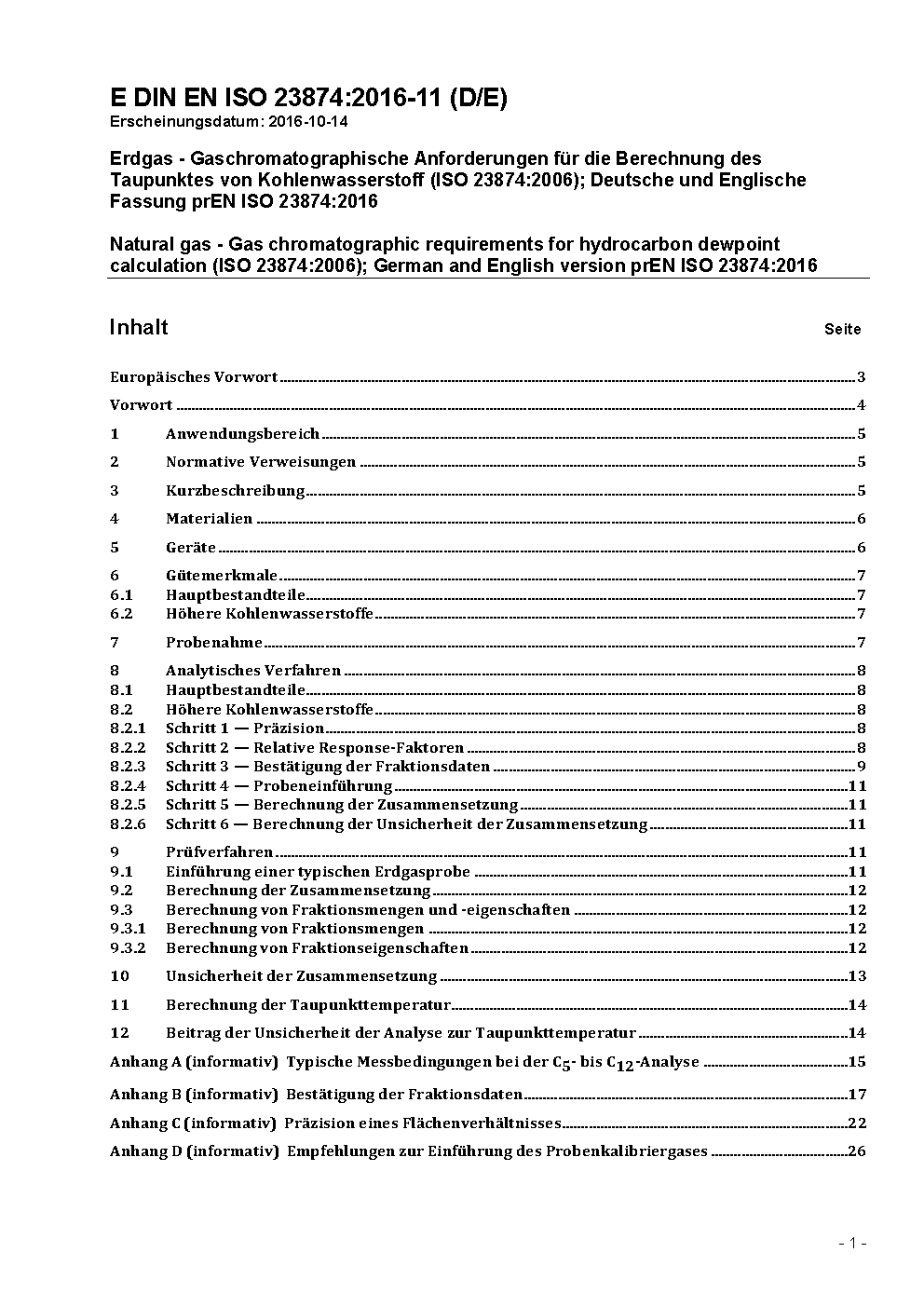 Erdgas - Gaschromatographische Anforderungen für die Berechnung des Taupunktes von Kohlenwasserstoff (ISO 23874:2006); Deutsche und Englische Fassung prEN ISO 23874:2016