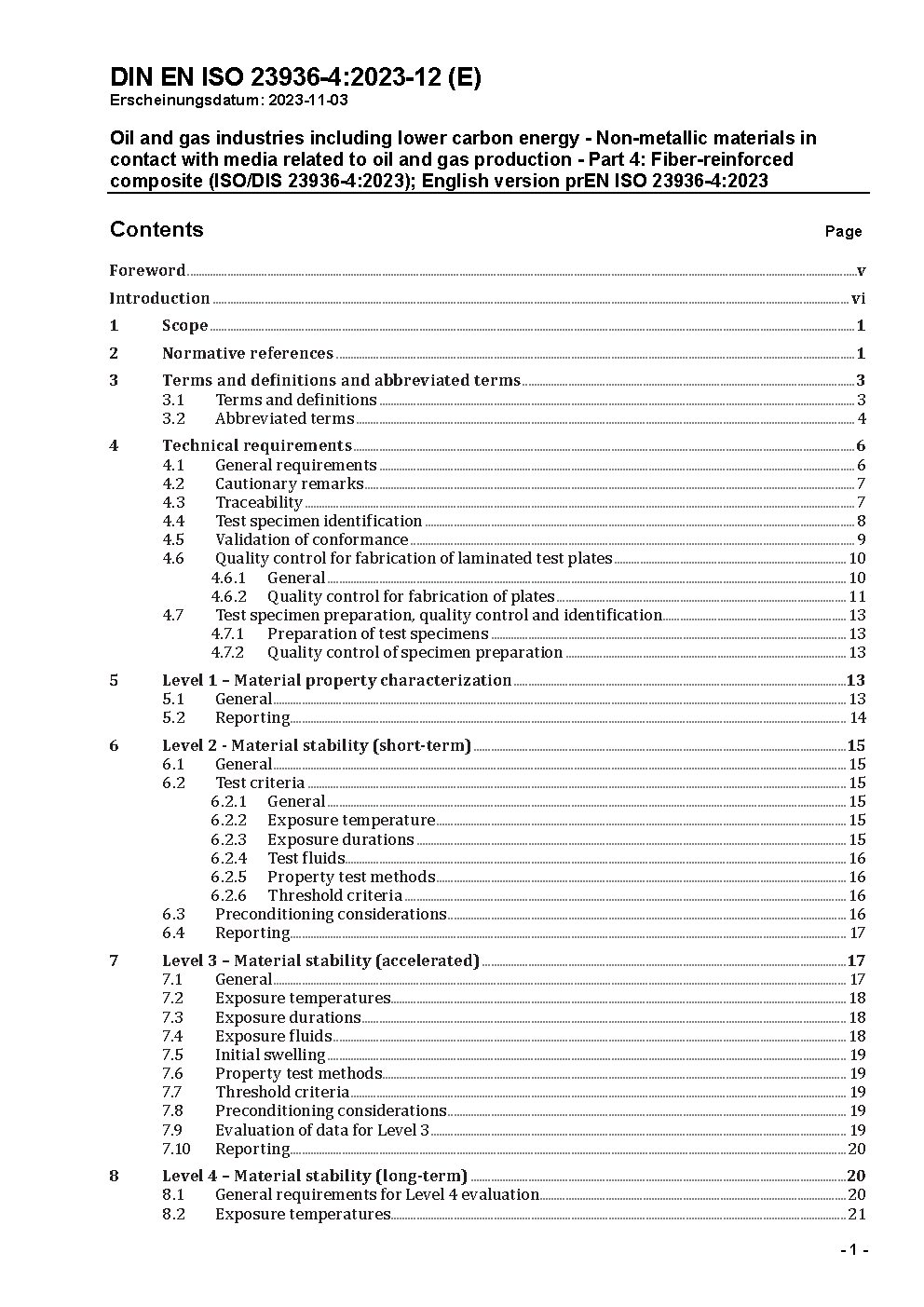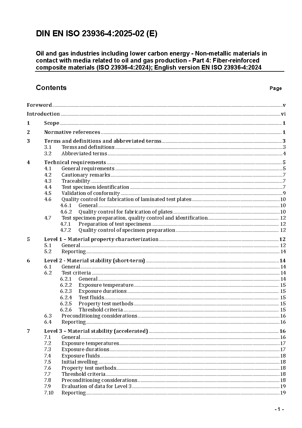 Öl- und Gasindustrie einschließlich kohlenstoffarmer Energieträger - Nichtmetallische Werkstoffe mit Medienkontakt bei der Öl- und Gasproduktion - Teil 4: Faserverstärkte Verbundwerkstoffe (ISO 23936-4:2024); Englische Fassung EN ISO 23936-4:2024