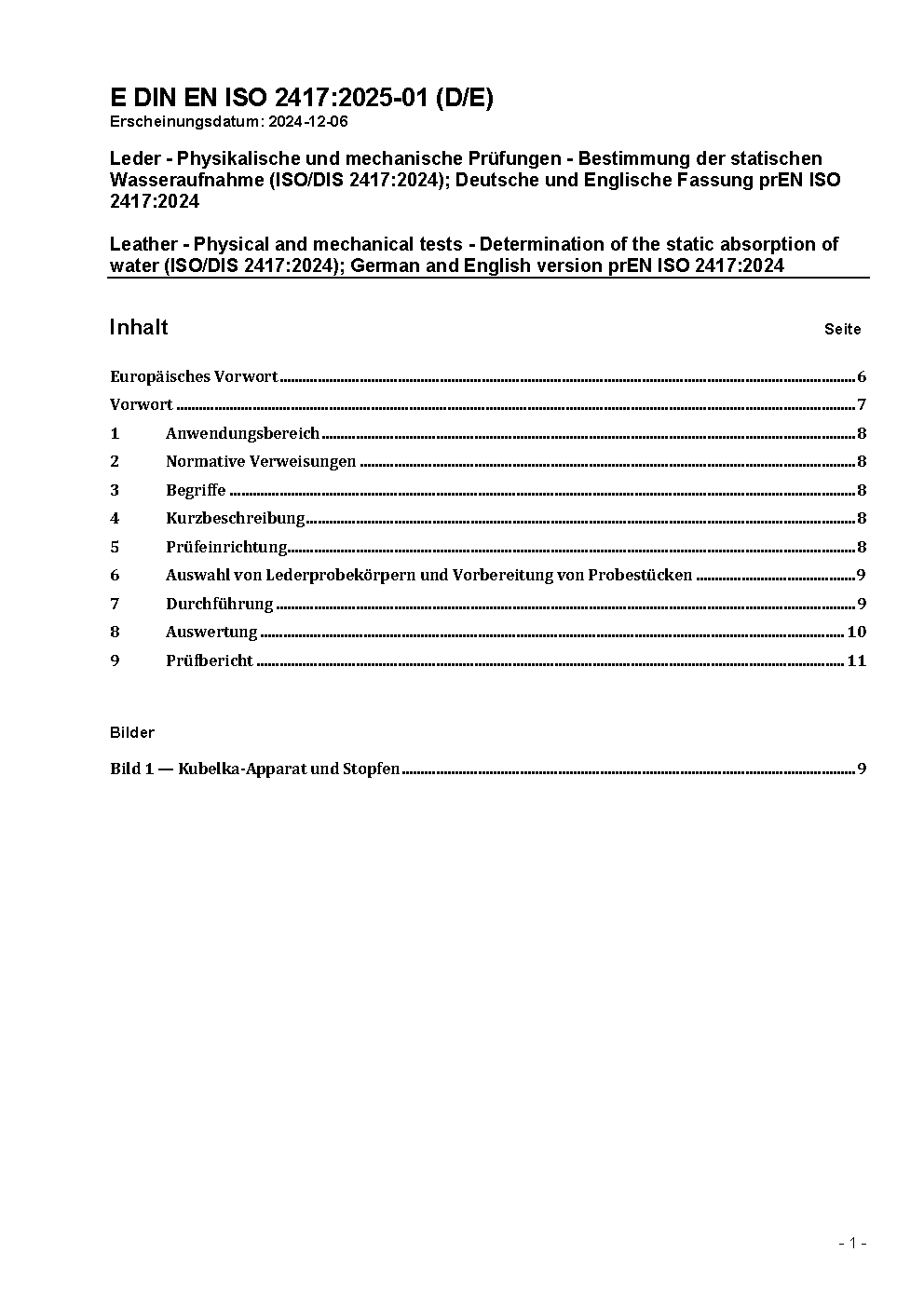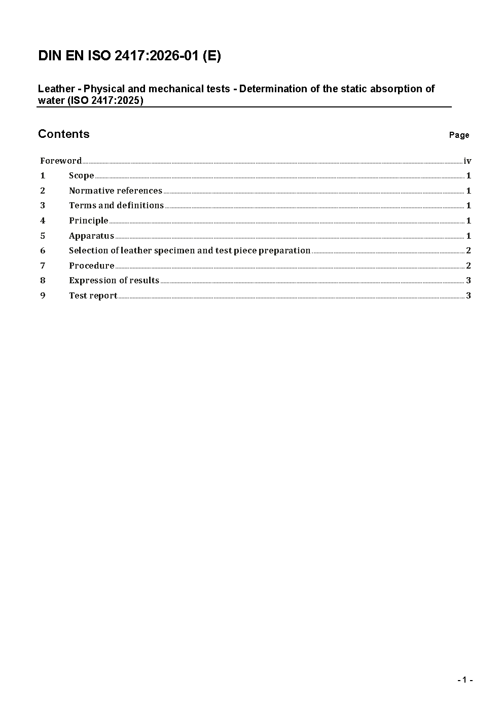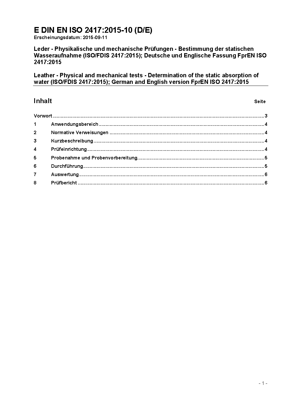 Leder - Physikalische und mechanische Prüfungen - Bestimmung der statischen Wasseraufnahme (ISO 2417:2002); Deutsche Fassung EN ISO 2417:2002