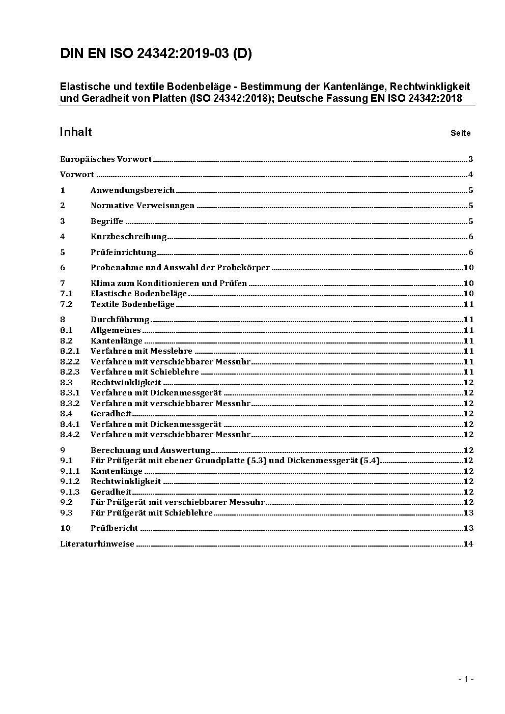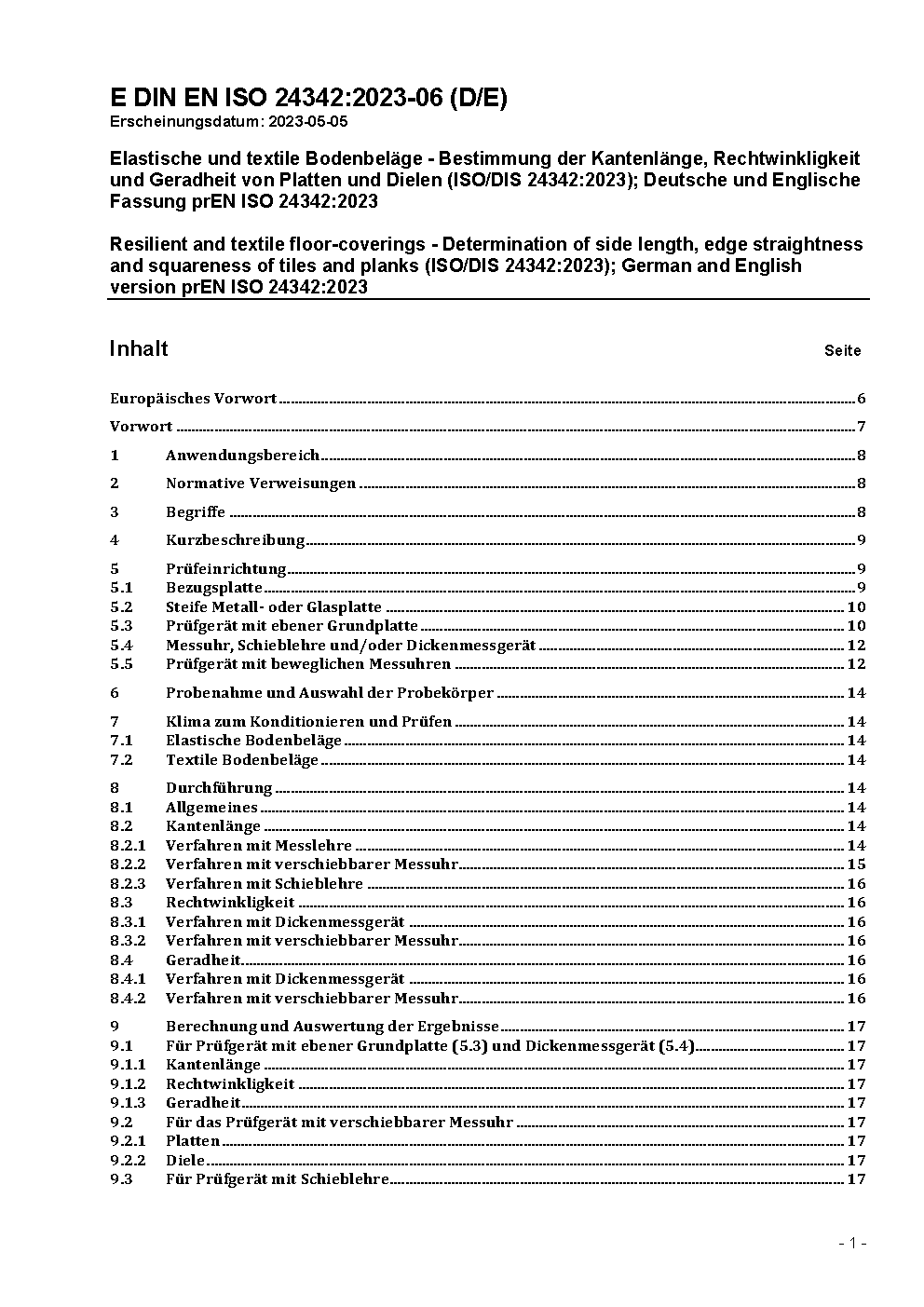 Elastische und textile Bodenbeläge - Bestimmung der Kantenlänge, Rechtwinkligkeit und Geradheit von Platten (ISO 24342:2007); Deutsche Fassung EN ISO 24342:2012