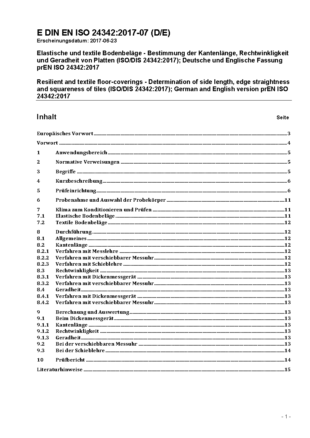 Resilient and textile floor-coverings - Determination of side length, edge straightness and squareness of tiles (ISO 24342:2007); German version EN ISO 24342:2012