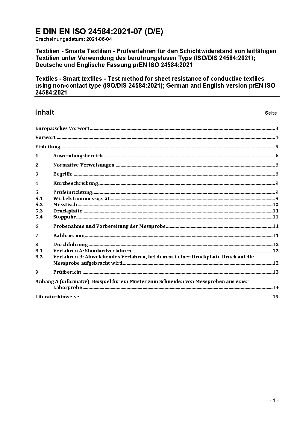 Textilien - Smarte Textilien - Prüfverfahren für den Schichtwiderstand von leitfähigen Textilien unter Verwendung des berührungslosen Typs (ISO/DIS 24584:2021); Deutsche und Englische Fassung prEN ISO 24584:2021