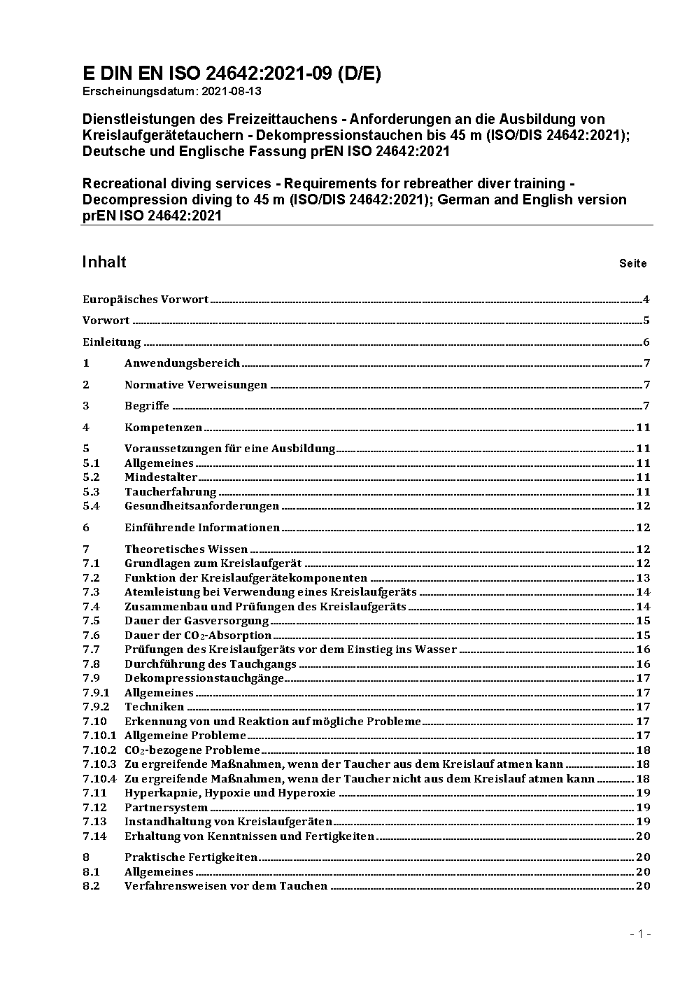 Dienstleistungen des Freizeittauchens - Anforderungen an die Ausbildung von Kreislaufgerätetauchern - Dekompressionstauchen bis 45 m (ISO/DIS 24642:2021); Deutsche und Englische Fassung prEN ISO 24642:2021